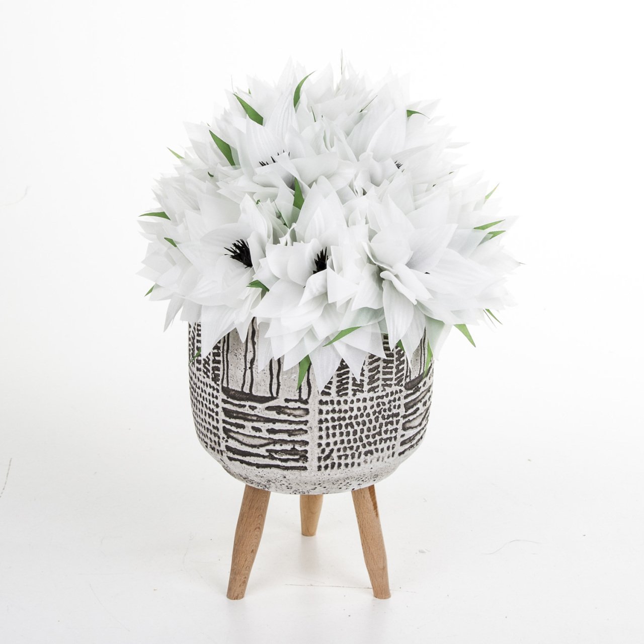 Yapay 15 Adet Beyaz Yıldız Çiçeği Ayaklı Antik Desen Beton Saksıda 20x30 Cm