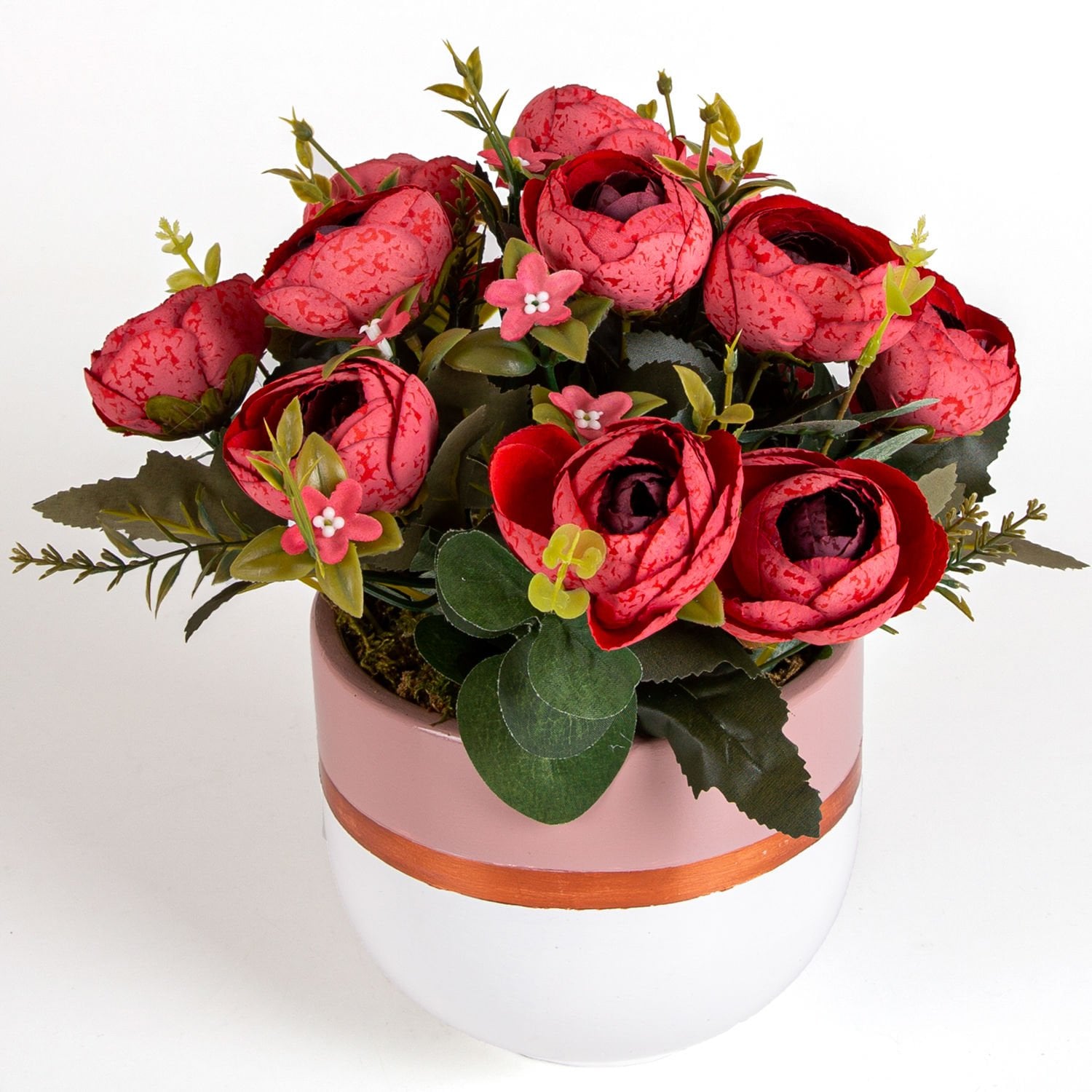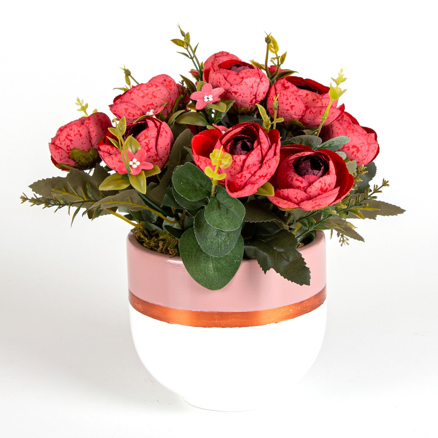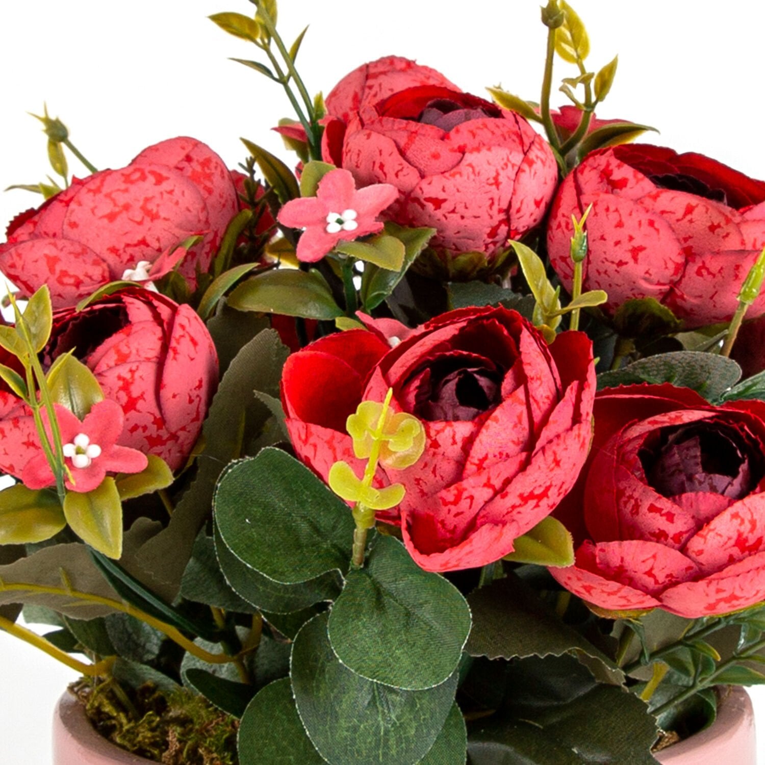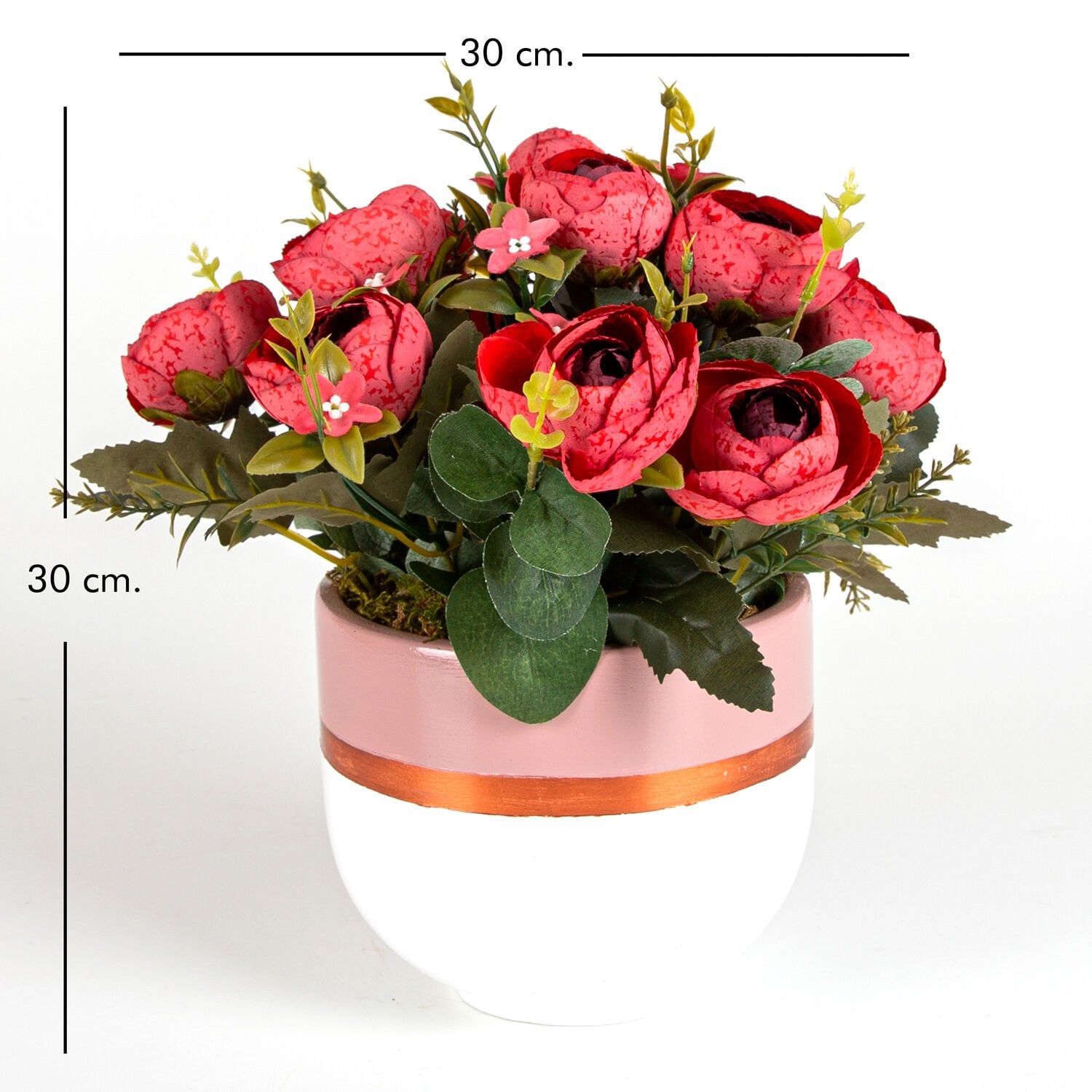Yapay Çiçek Aranjmanı, Kırmızı Şakayık, Pudrapembe-Beyaz - Beton Saksıda, 30 x 30 cm