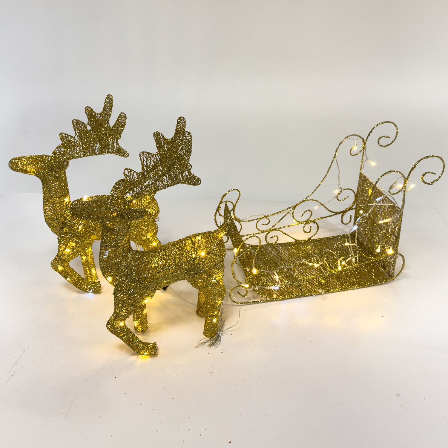 Yılbaşı Dekor, Metal Çift Geyik ve Kızak, Gold - Işıklı, 50x55 cm