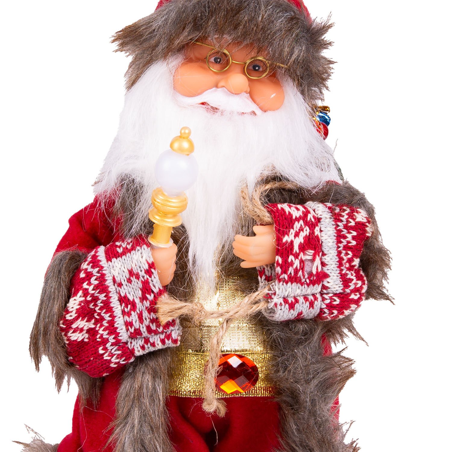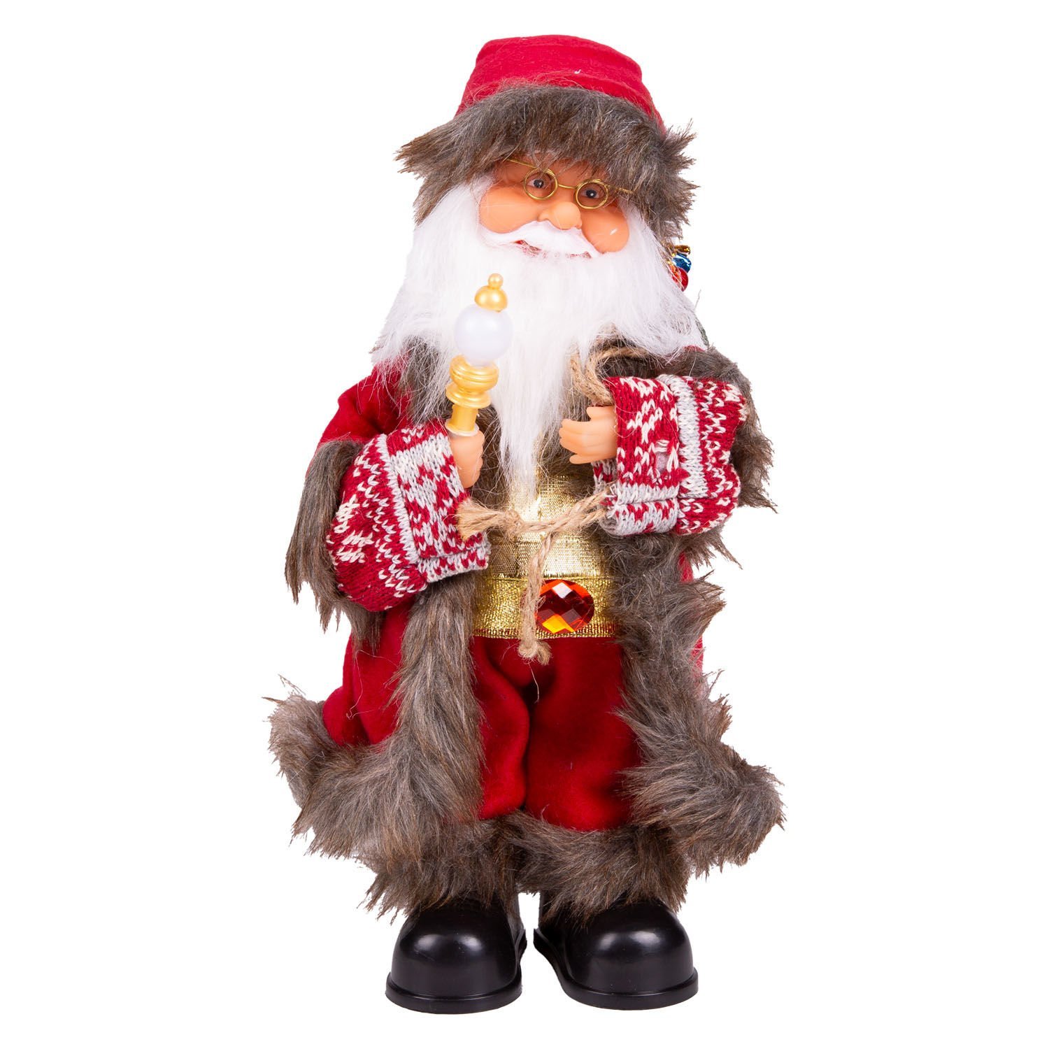 Yılbaşlarının olmazsa olmazı , sevimli görünümleriyle yılbaşı konseptinin tamamlayıcı unsurlarından olan içinde hediye paketleri bulunan jüt Yılbaşı Dekorlu torba , sağ elinde tuttuğu ışıklı Asa detayıyla, kaliteli kırmızı renkli giysisi ve şapkası, ayrıca şapkasında bulunan metal ses çıkaran çıngırak ayrıntısıyla Işıklı Hareketli Ve Müzikli noel baba figürü evlerinize neşe ve mutluluk getiriyor. elindeki asasında renkli ışık yanmaktadır ve başı ve elleri noel şarkısıyla hareket etmektedir.