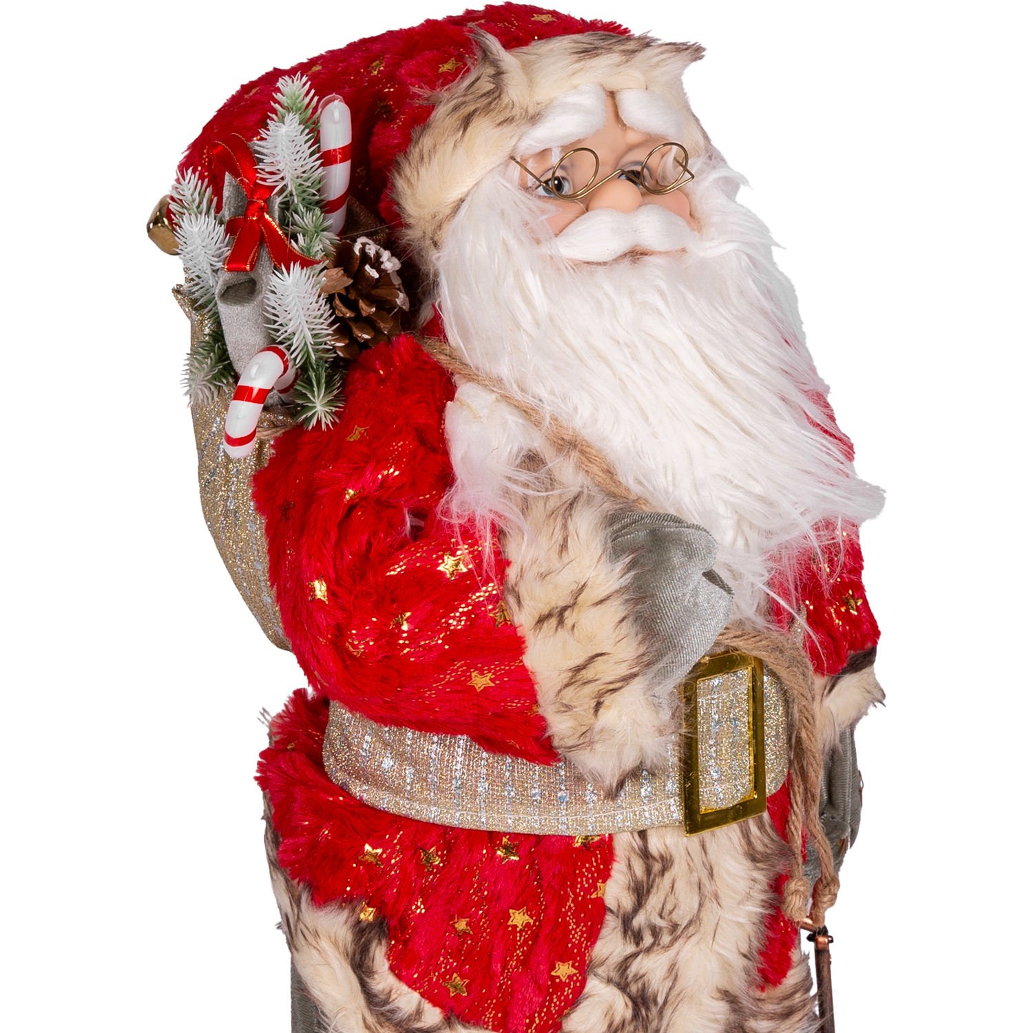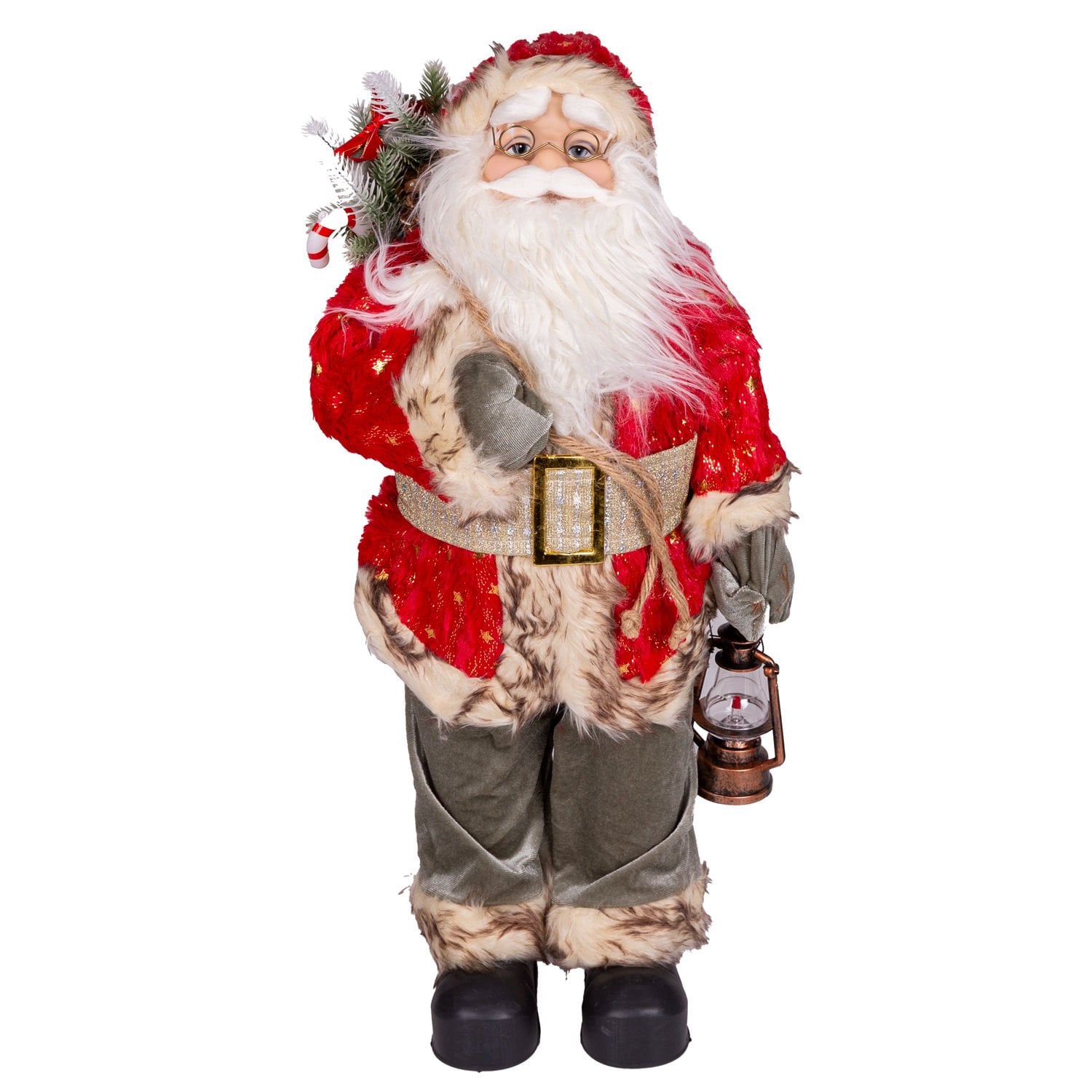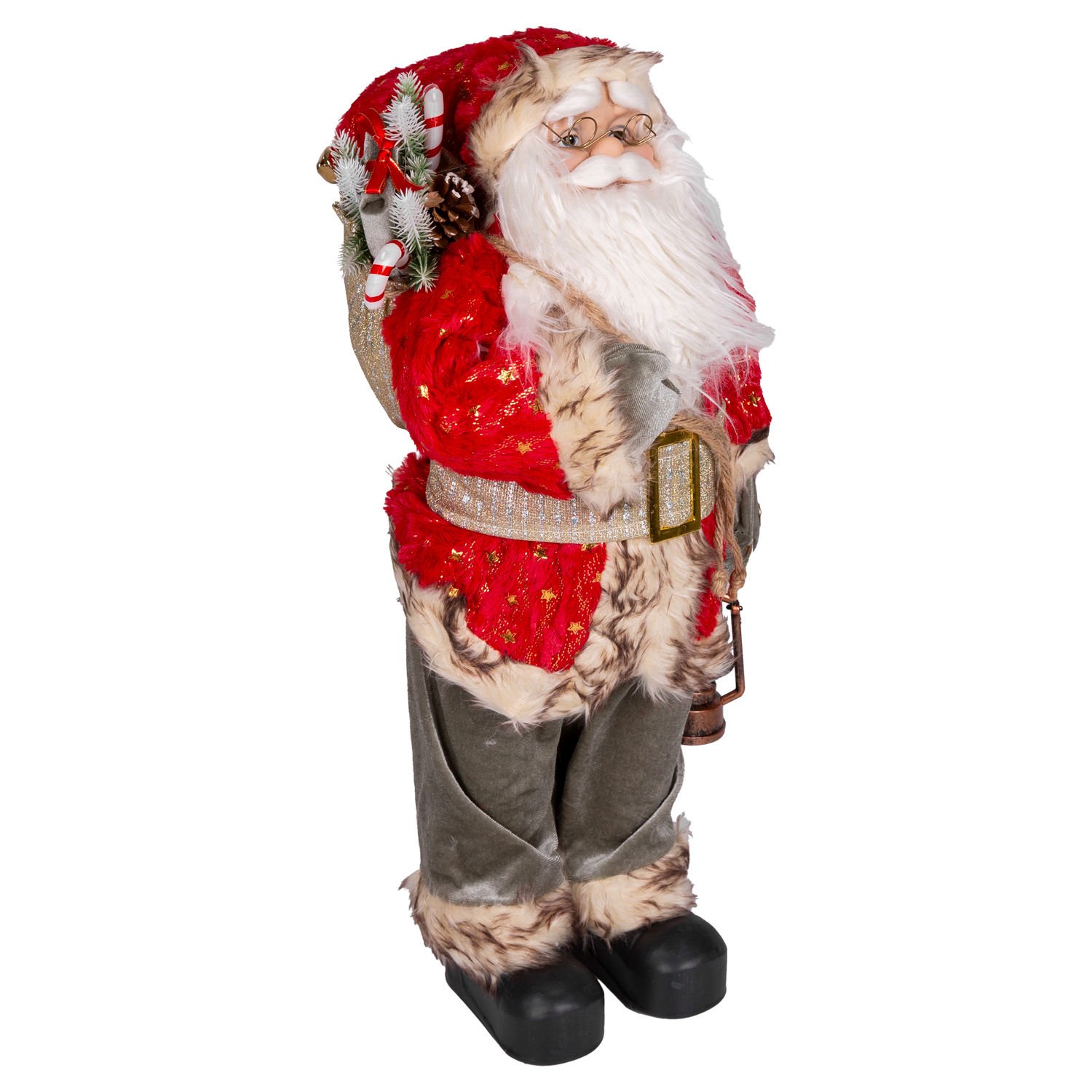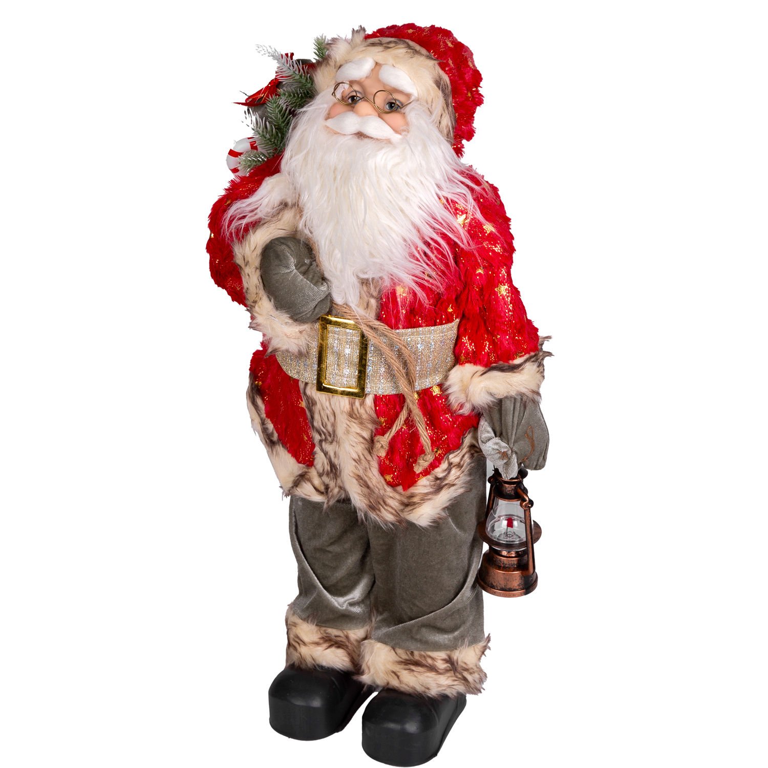 Yılbaşlarının olmazsa olmazı , sevimli görünümleriyle yılbaşı konseptinin tamamlayıcı unsurlarından olan içinde hediye paketi , çam kozalağı, kar efektli çam dalları ve baston şeker dolu gold işlemeli Yılbaşı Dekorlu torba , sol elinde tuttuğu fener , kaliteli gold renkli yıldızlar işlemeli kırmızı renkli giysisi ve şapkası, ayrıca şapkasında bulunan metal ses çıkaran çıngırak ayrıntısıyla noel baba figürü evlerinize neşe ve mutluluk getiriyor.