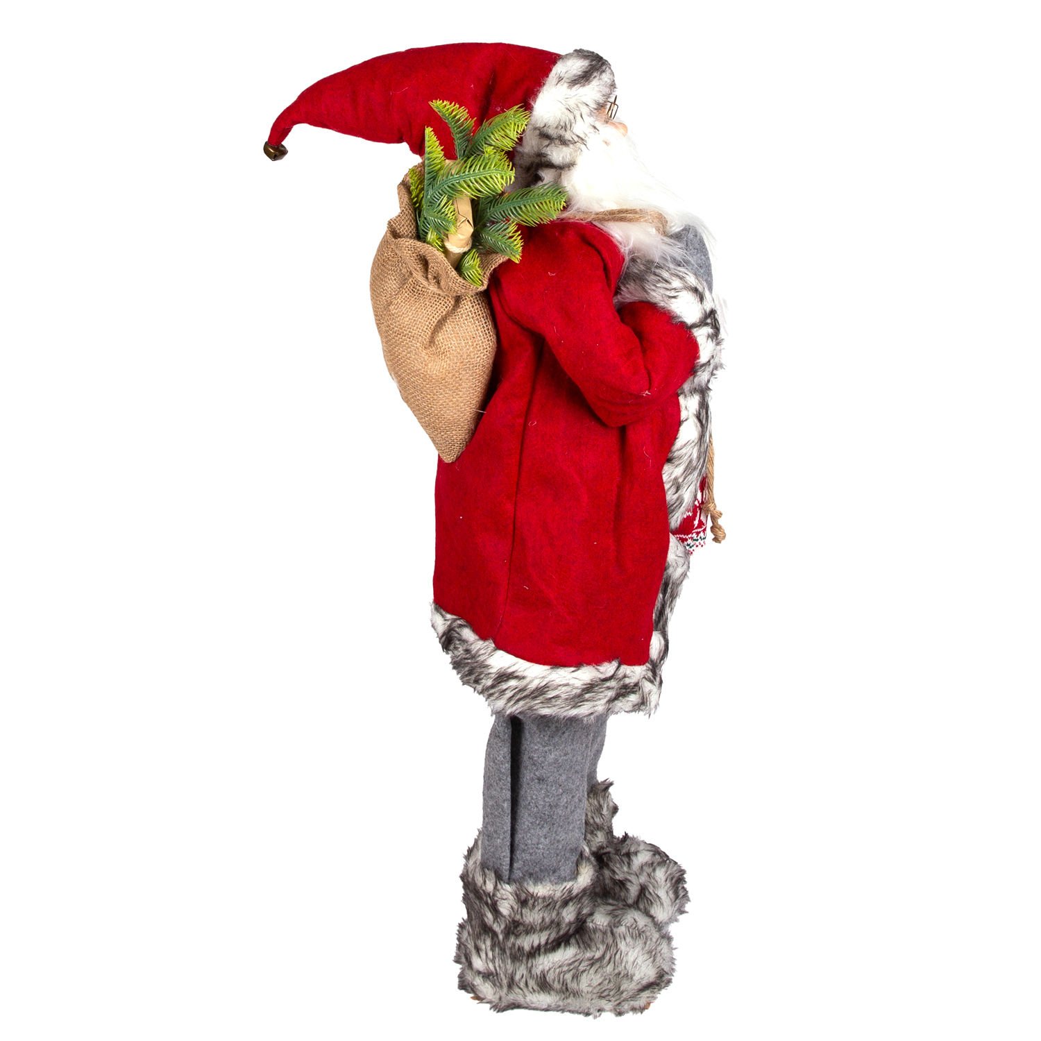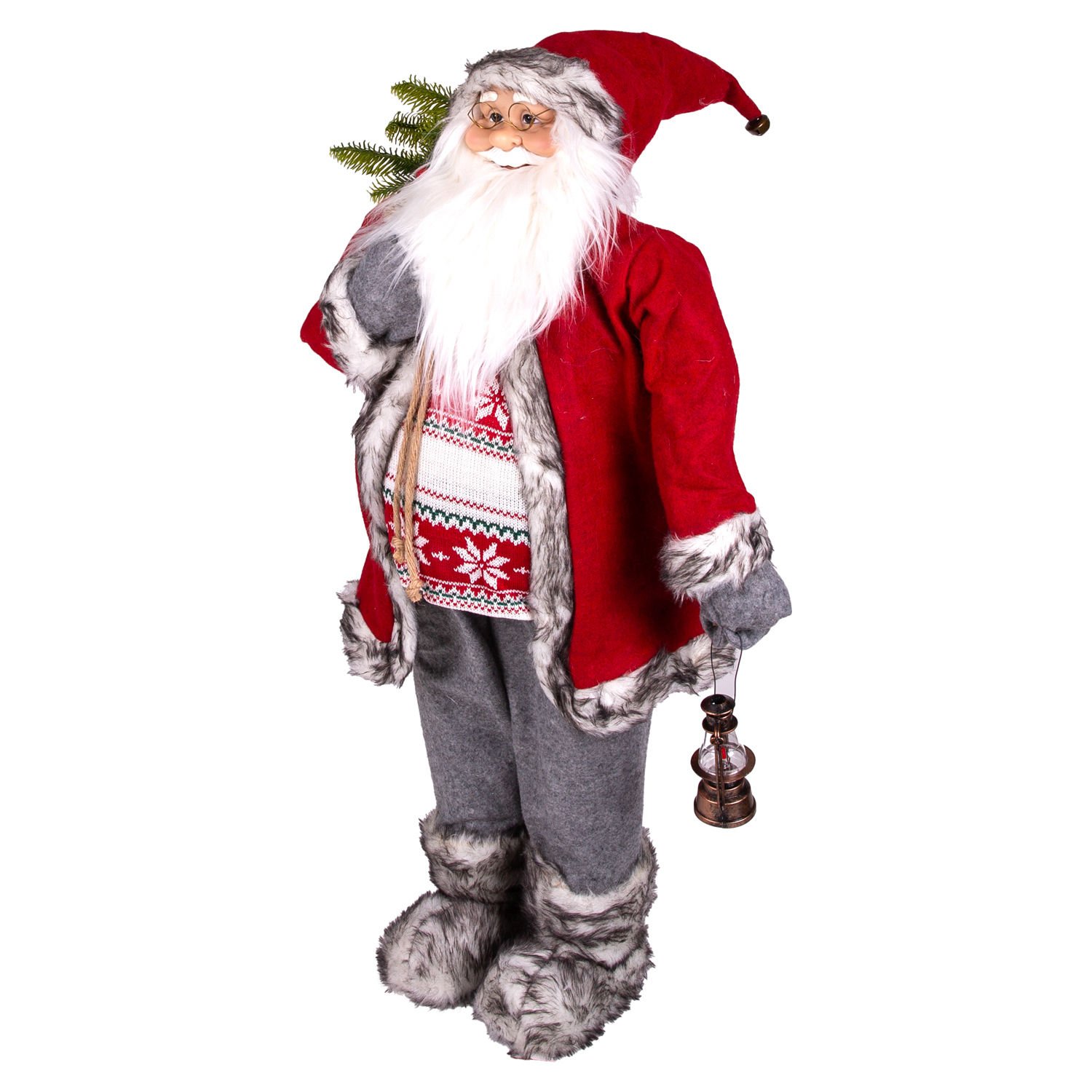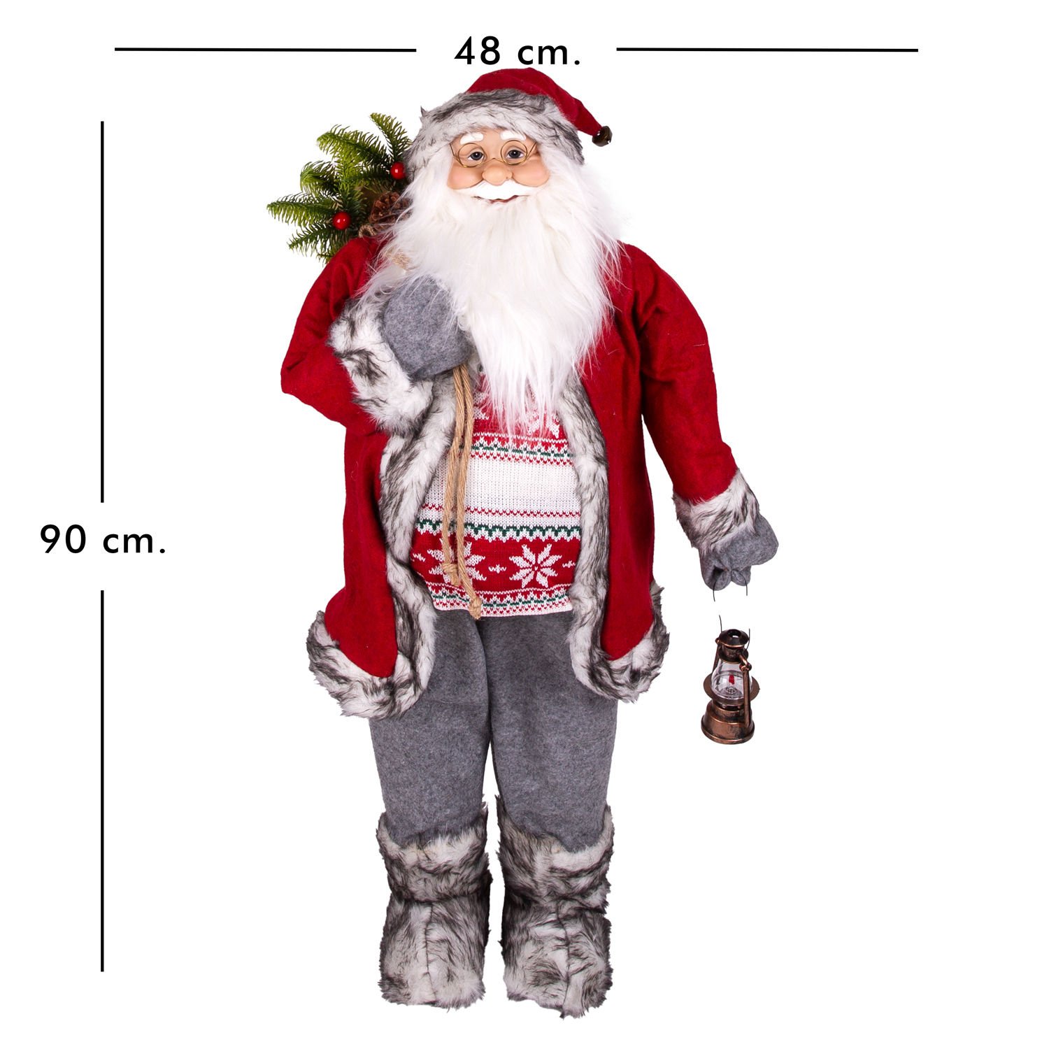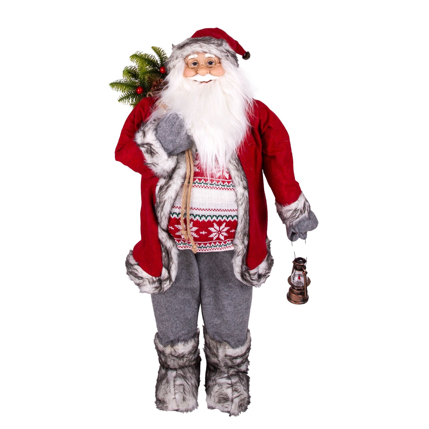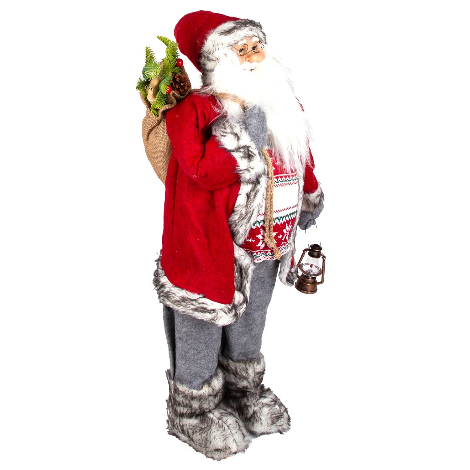 Yılbaşı Noel Baba, Hediye Çuvallı, Fenerli, Gri Pantolonlu, Kırmızı-Gri - 90 cm