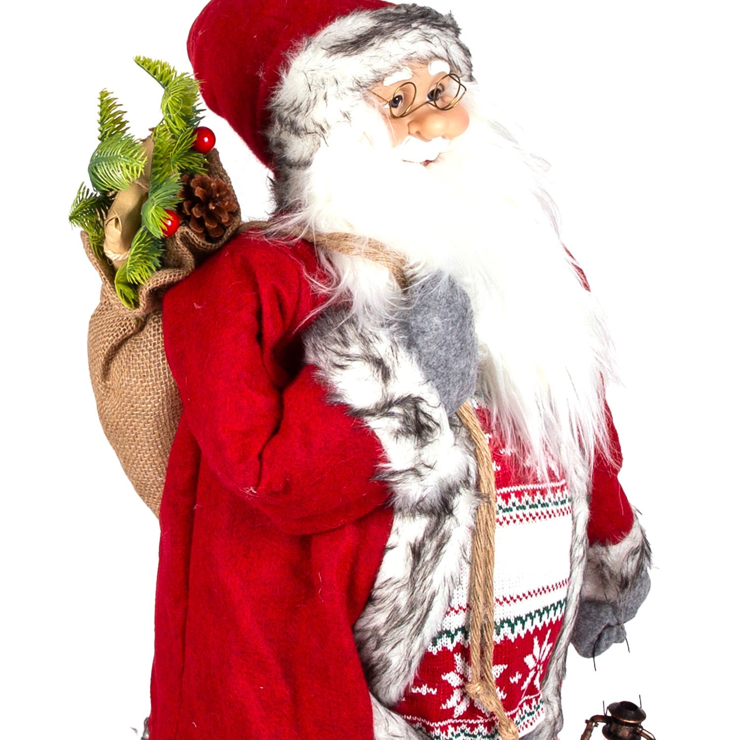 Yılbaşlarının olmazsa olmazı , sevimli görünümleriyle yılbaşı konseptinin tamamlayıcı unsurlarından olan içinde hediye paketi , berry dalı ve kozalaklı çam dalı dolu Yılbaşı Dekorlu torba , sol elinde taşıdığı feneri , kaliteli gri pantolonu , klasik kırmızı paltosu ,yılbaşı desenli kazağı ve ayrıca şapkasında ya da üzerinde bulunan metal ses çıkaran çıngırak ayrıntısıyla noel baba figürü evlerinize neşe ve mutluluk getiriyor.