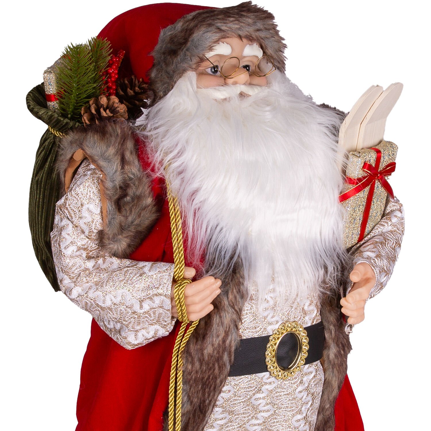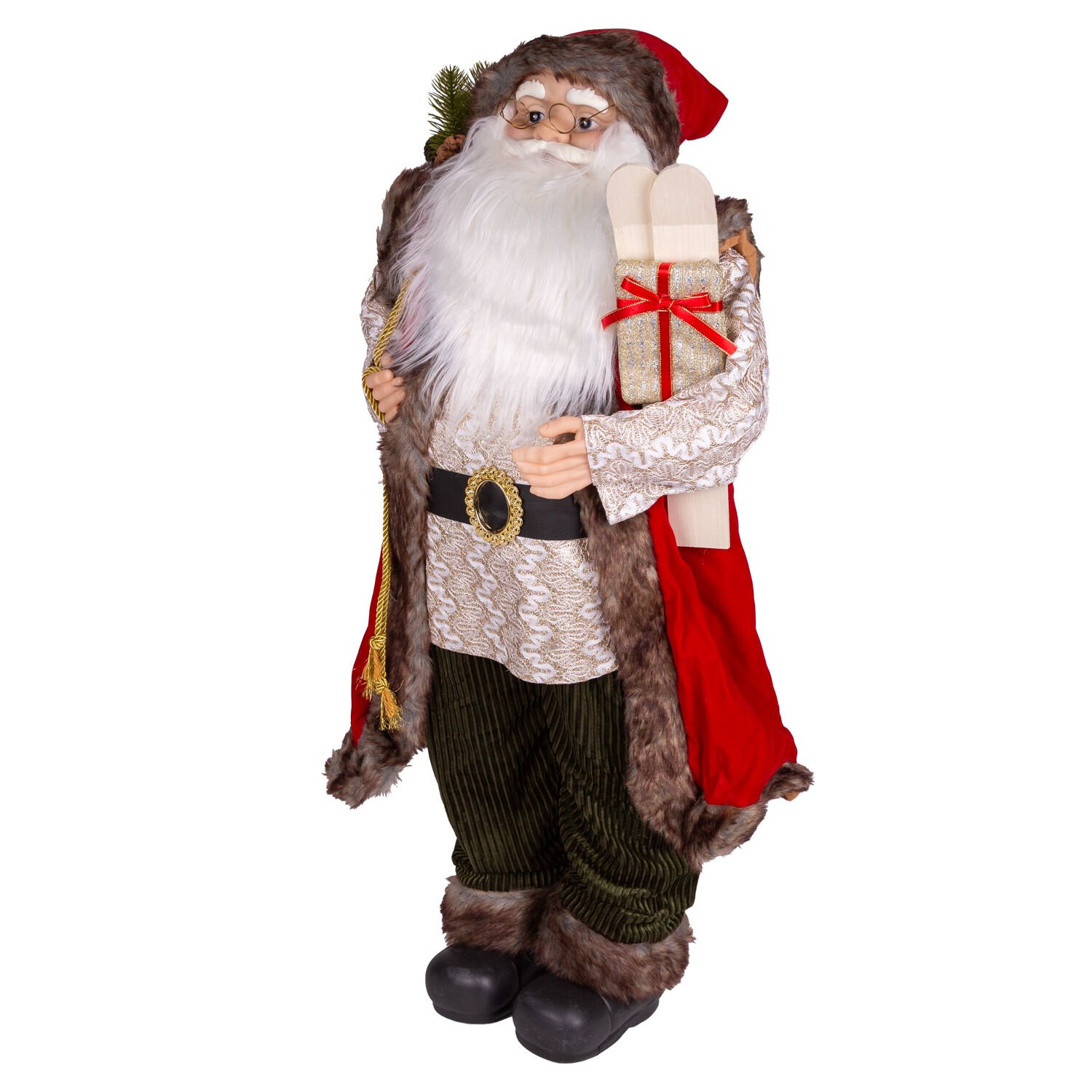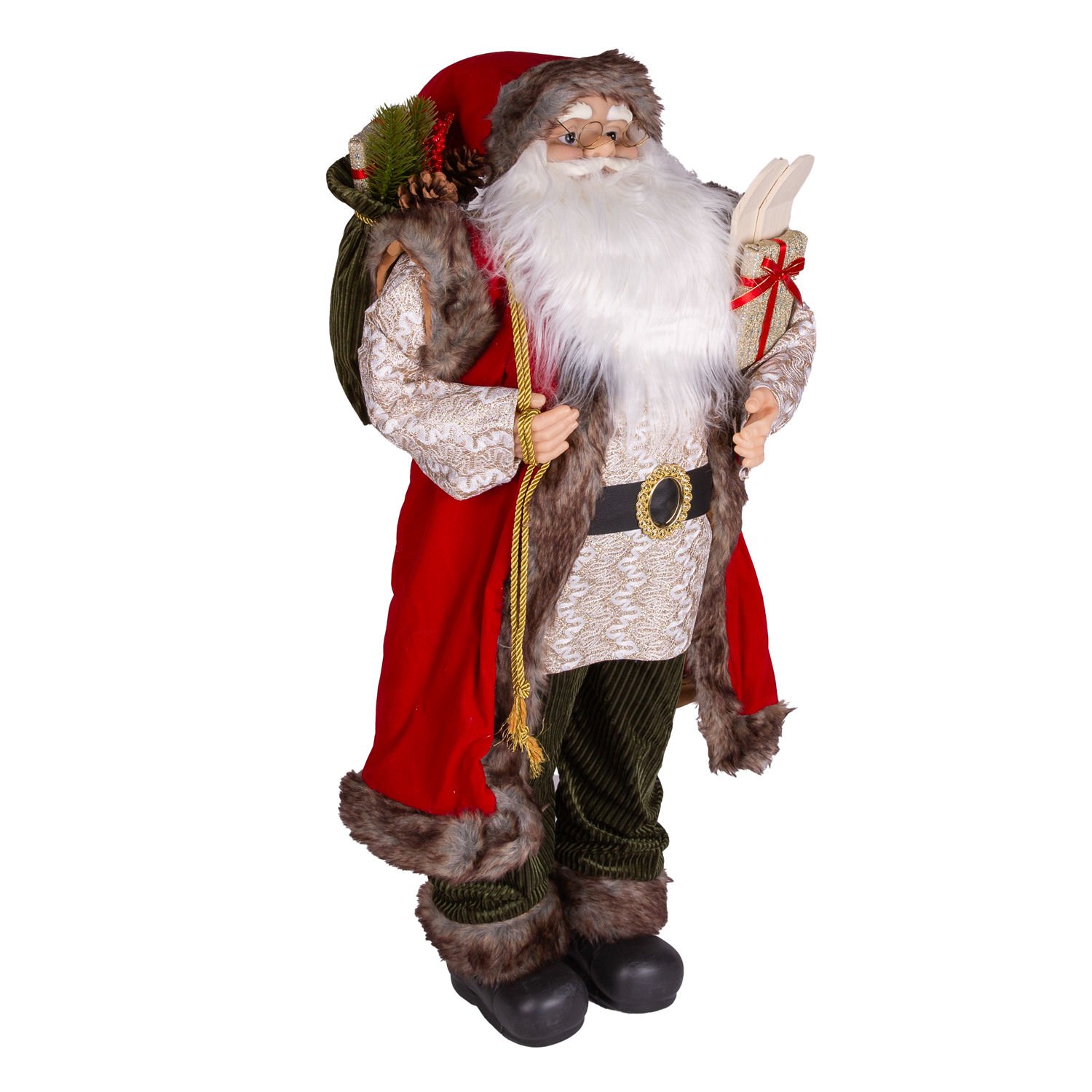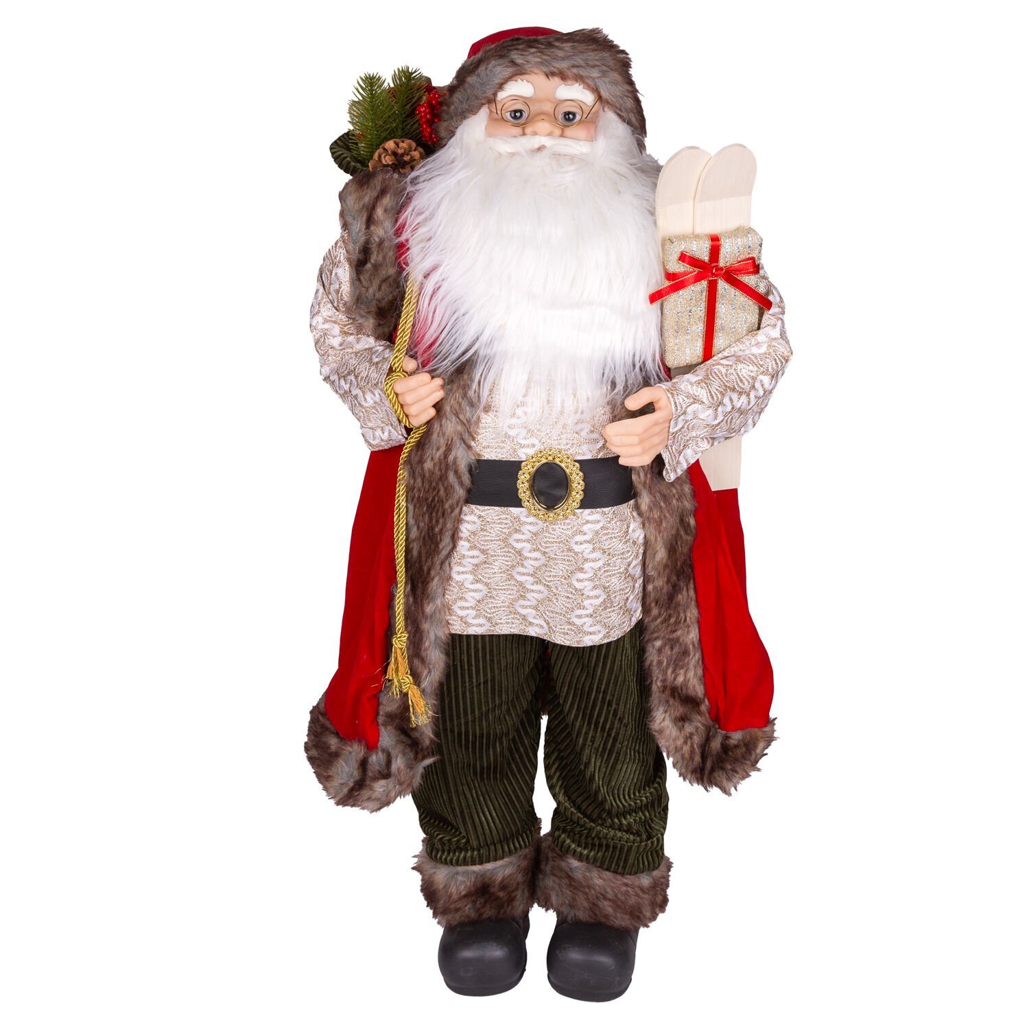 Yılbaşlarının olmazsa olmazı , sevimli görünümleriyle yılbaşı konseptinin tamamlayıcı unsurlarından olan içinde gold renkte hediye paketi , çam dalları , kozalak ve berry dal figürü dolu yeşil Yılbaşı Dekorlu torba , sol elinde tuttuğu kayak takımı ve kırmızı kurdaleli gold renkli hediye paketi bulunan , kaliteli kadife kırmızı giysisi ve şapkası, gold renkli işlemeli giysisi ayrıca şapkasında bulunan metal ses çıkaran çıngırak ayrıntısıyla noel baba figürü evlerinize neşe ve mutluluk getiriyor.