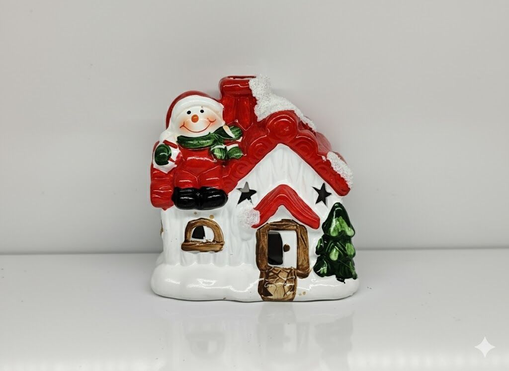 Yılbaşı Süsü, Beyaz Ev, Çatıda Kardan Adam Figürlü - Işıklı, Seramik