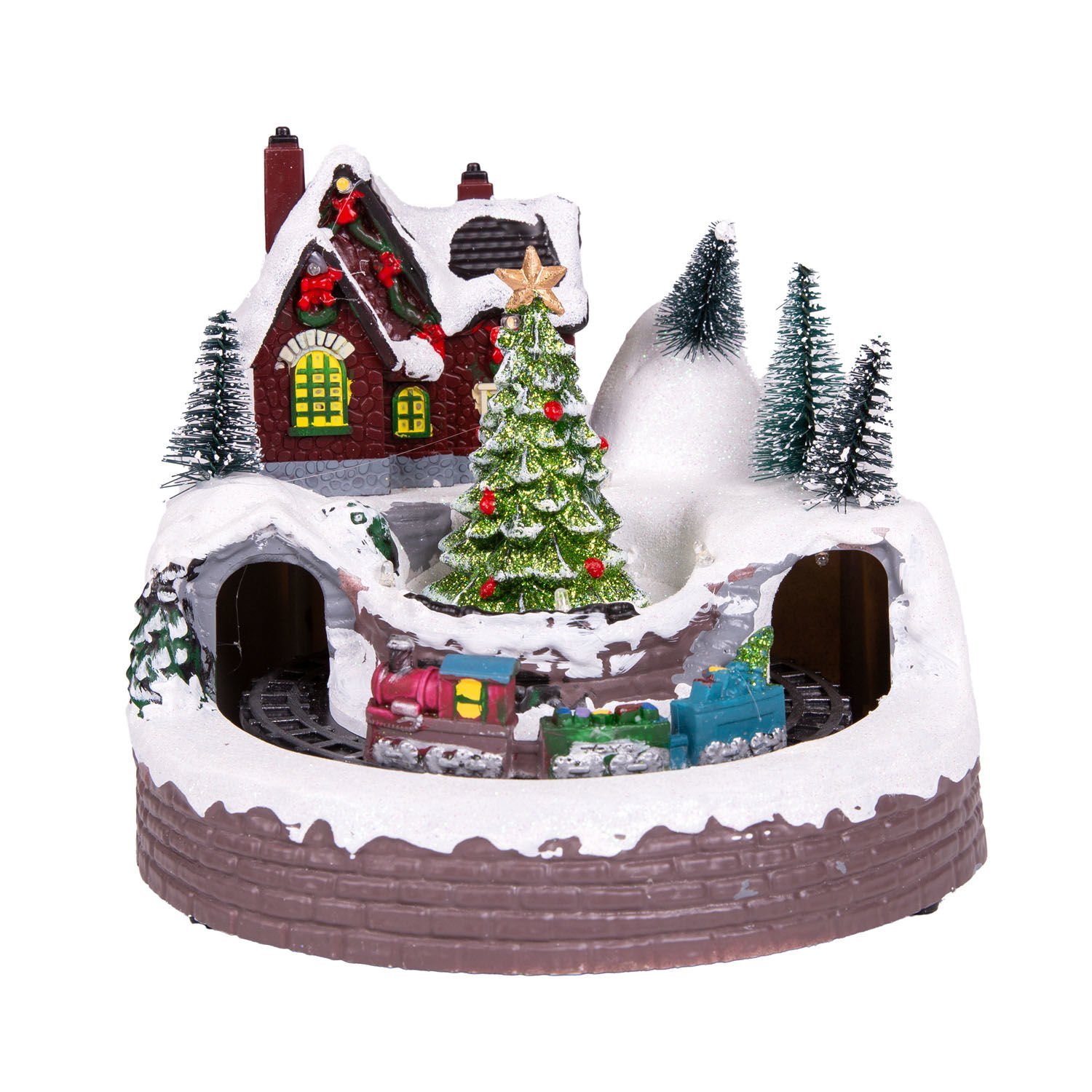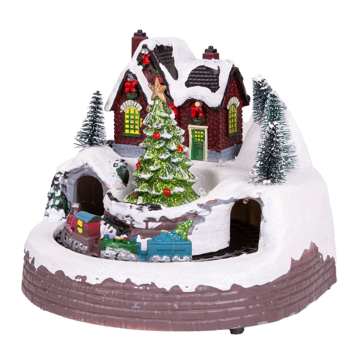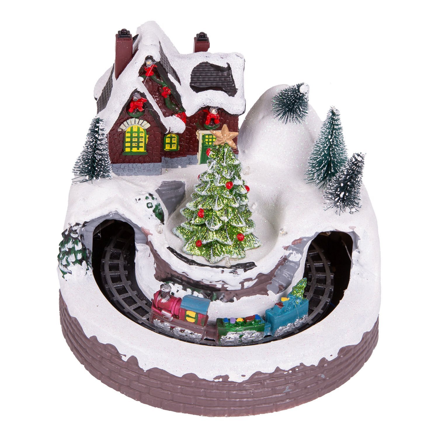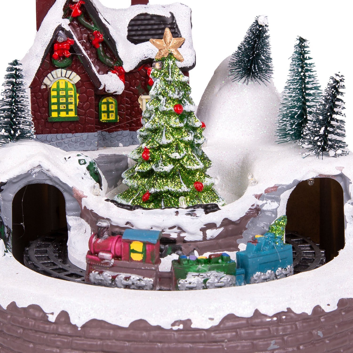 Yılbaşı Süsü, Dekor, Dağ Evi Tren Detaylı, Kahverengi-Beyaz - Hareketli, Müzikli, Işıklı, 20x18 cm