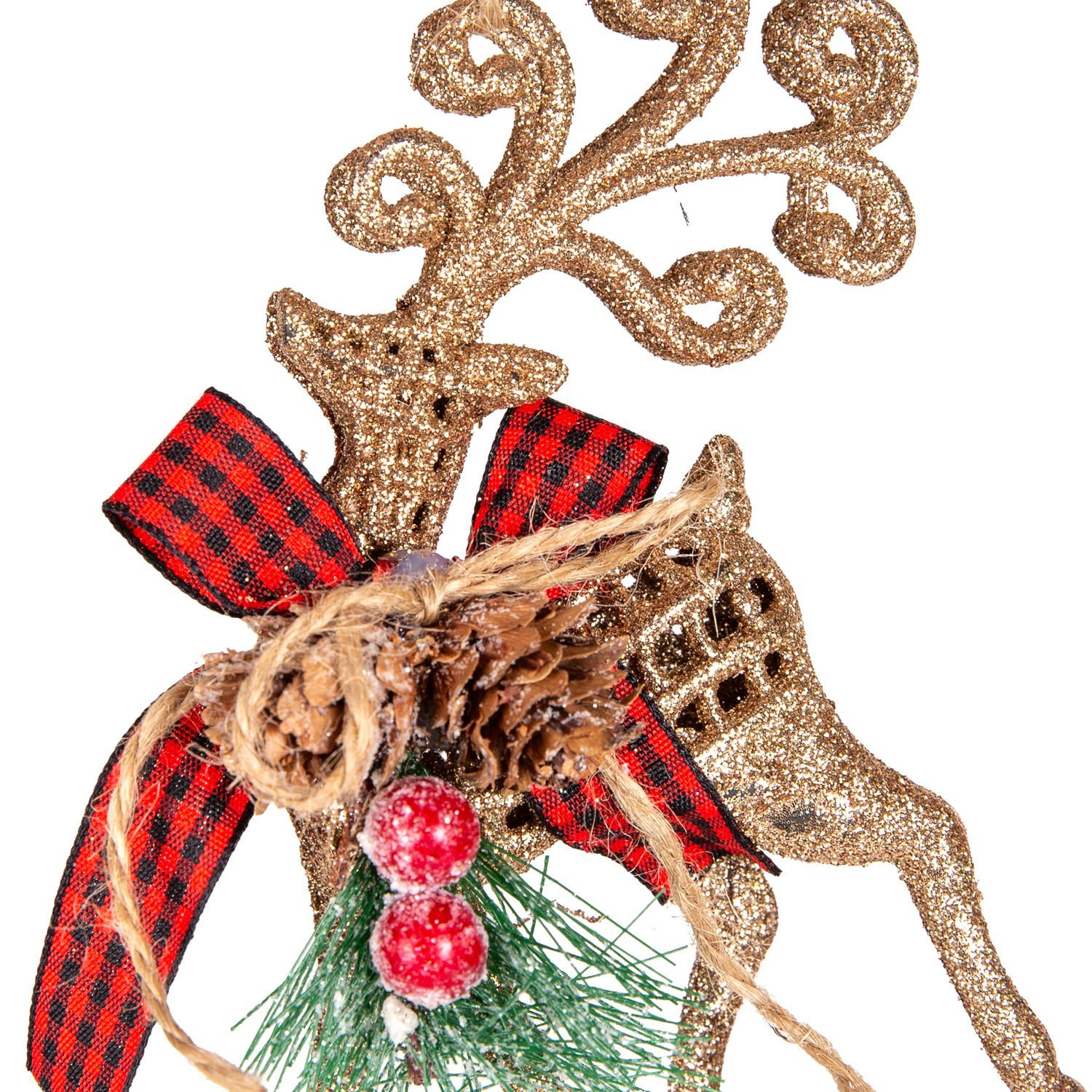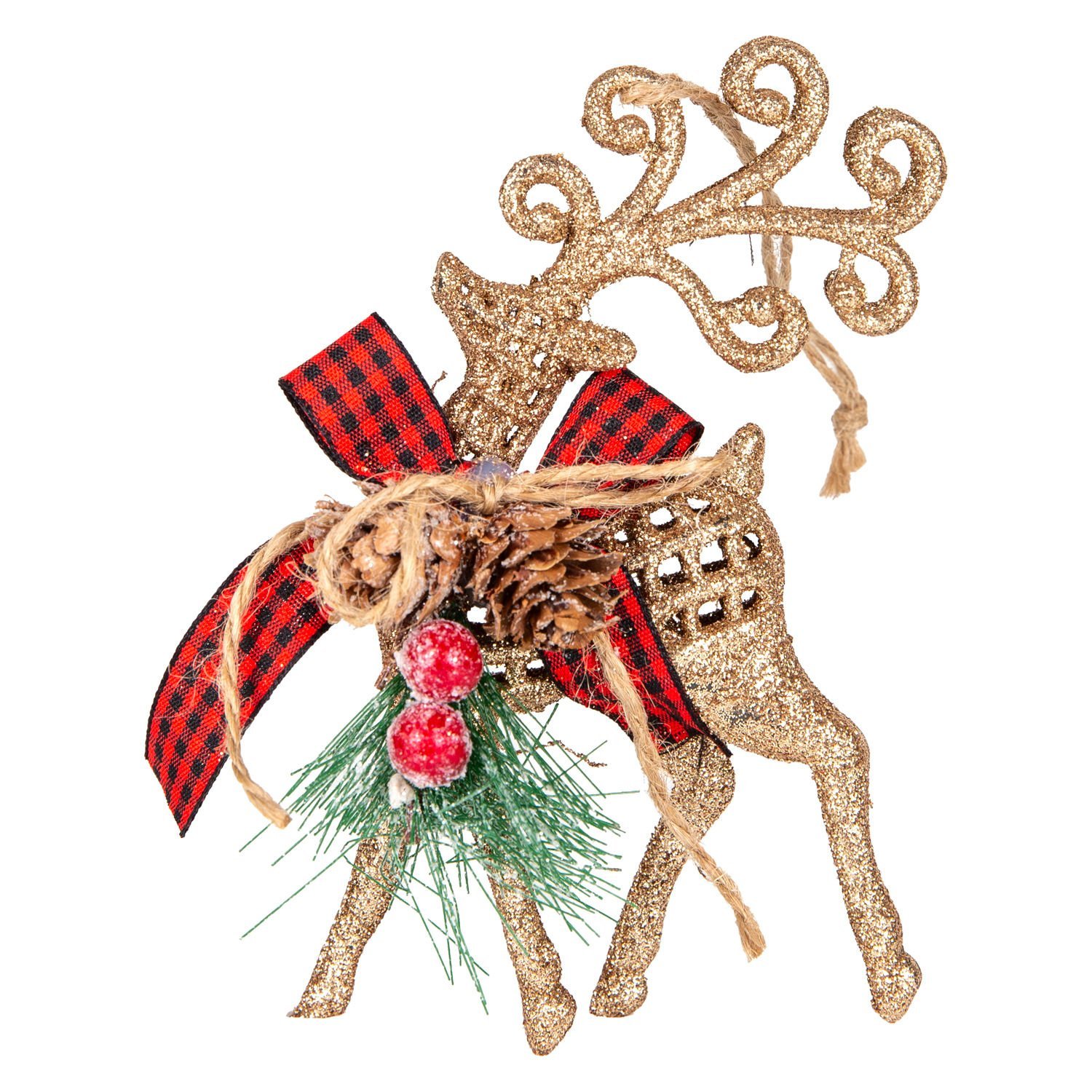 Yılbaşı Süsü, Geyik, Ekose Desenli, Kurdelalı, Simli, Gold - 8x15 cm