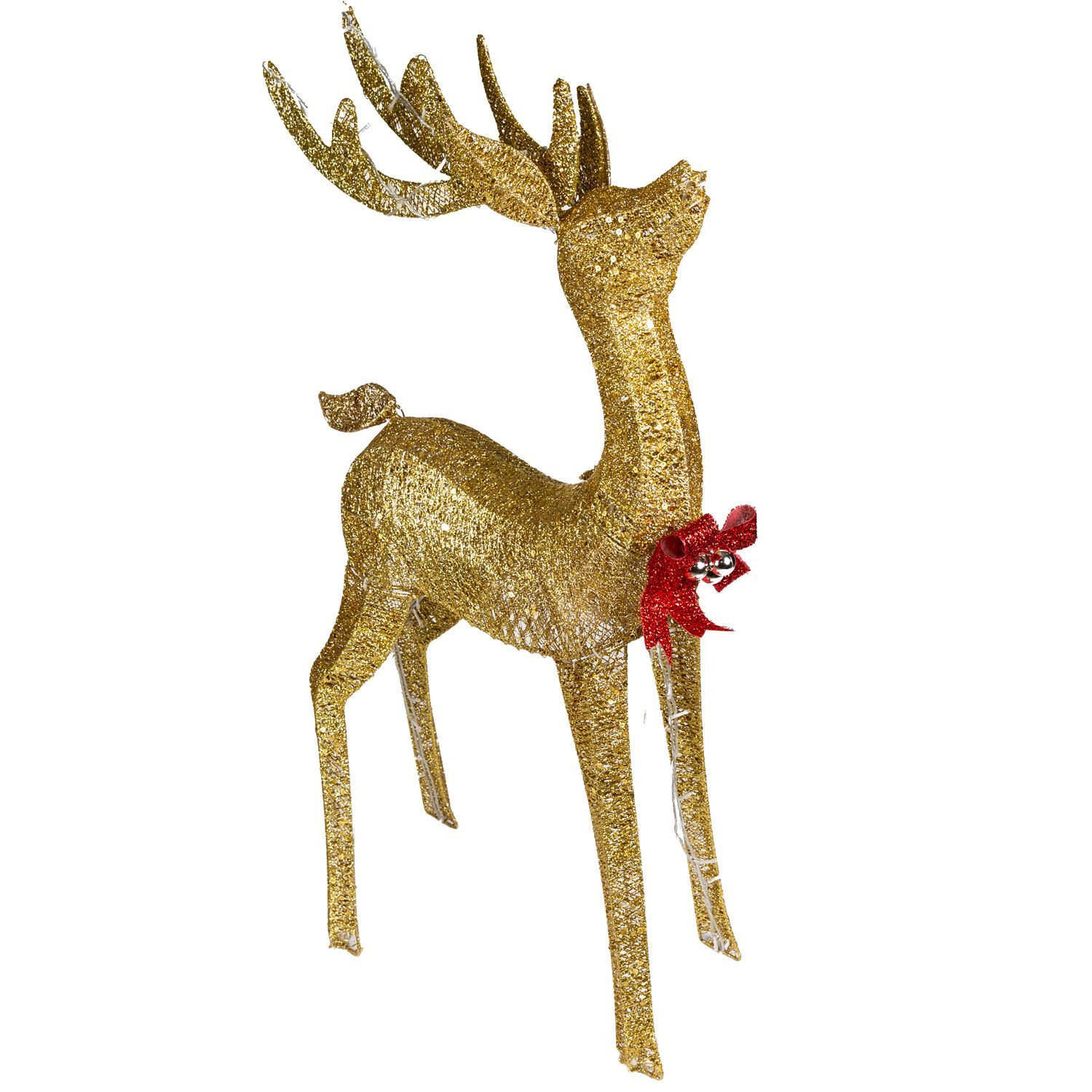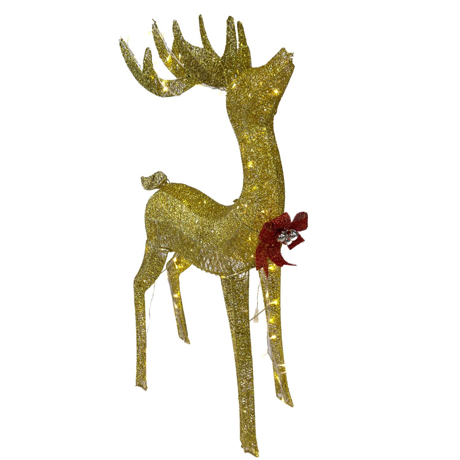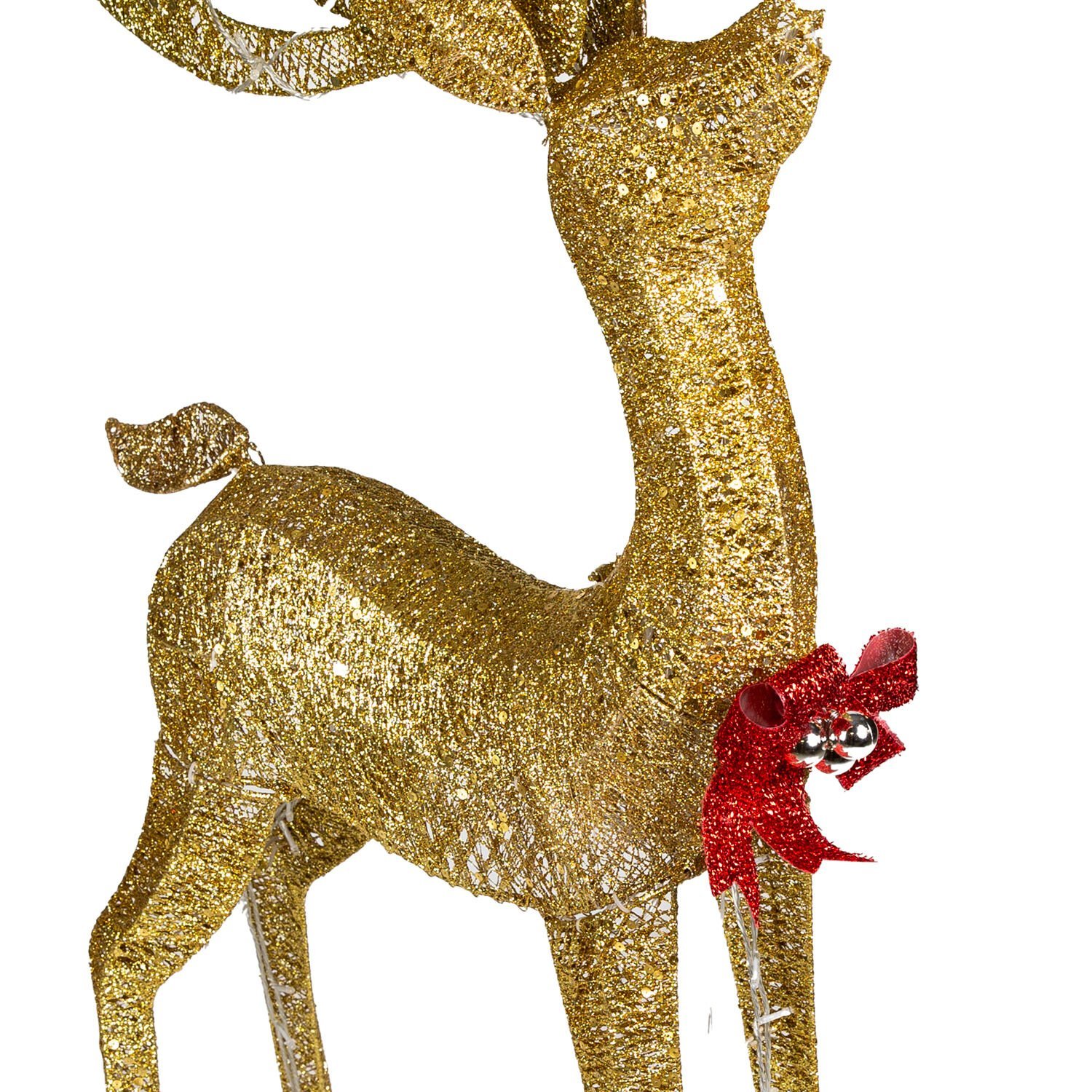 Yılbaşı Süsü, Geyik, Gold - Metal, Işıklı, Simli, Kırmızı Fiyonklu, 63x110 cm