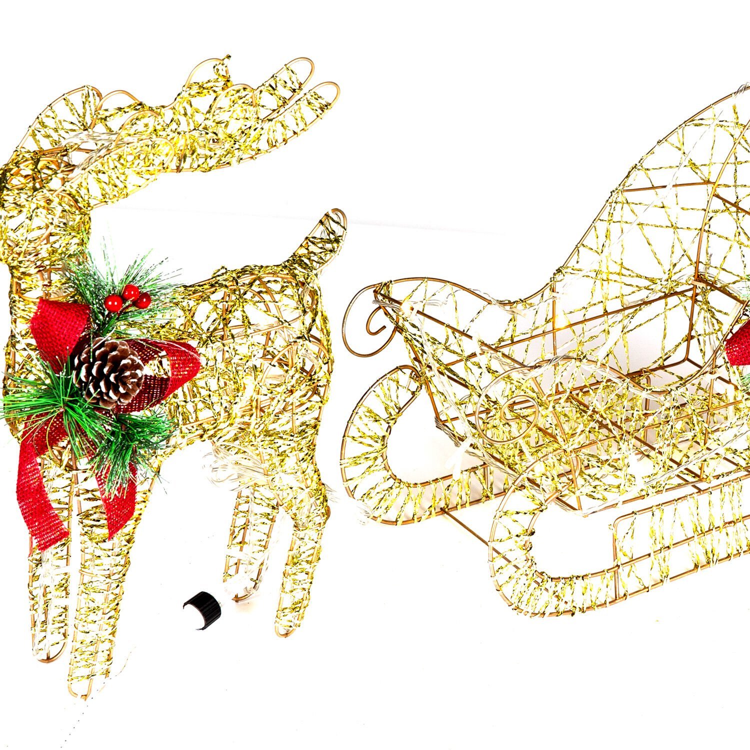 Yılbaşı Süsü, Geyik ve Kızak, Gold - Metal, Işıklı, Simli, Kırmızı Fiyonklu, Kozalaklı Çam Detaylı, 45x38 cm