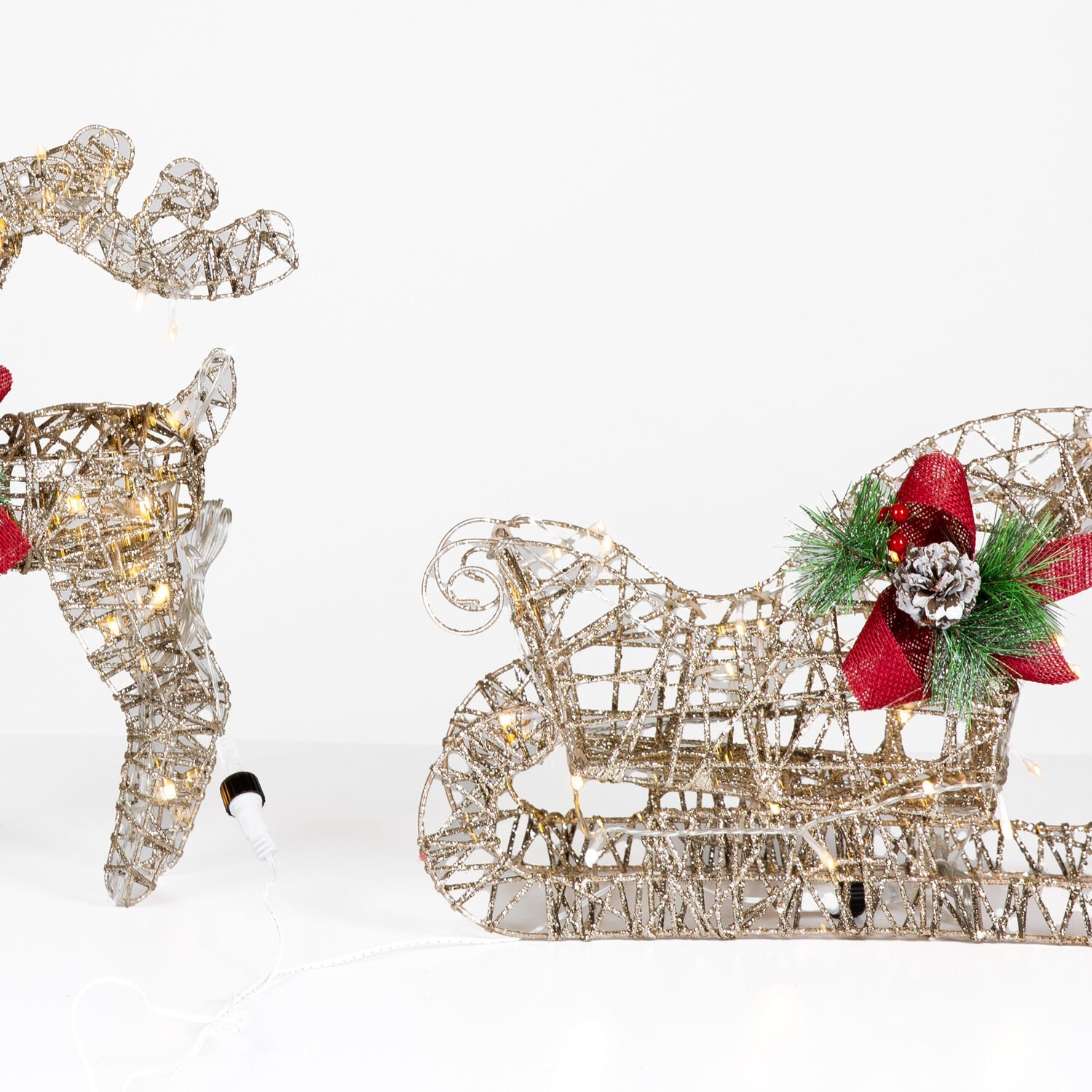 Yılbaşı Süsü, Geyik ve Kızak, Şampanya - Metal, Işıklı, Simli, Kırmızı Fiyonklu, Kozalaklı Çam Detaylı, 45x38 cm