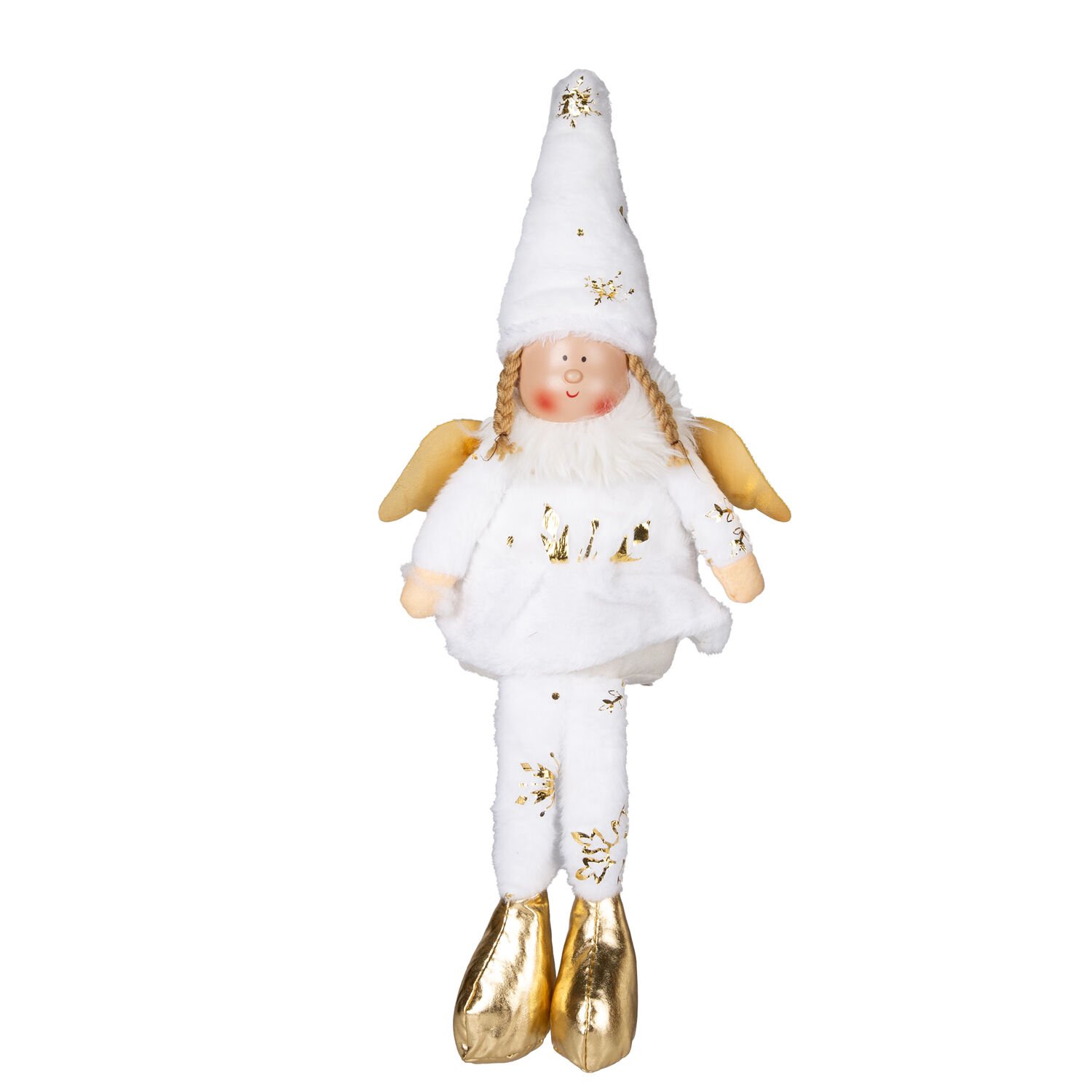 Yılbaşı Oturan Kanatlı Peri Figürü (53 cm, Beyaz-Gold): Beyazın Saflığı ve Gold Ayakkabıların Zarafetiyle Masum ve Işıltılı Süs