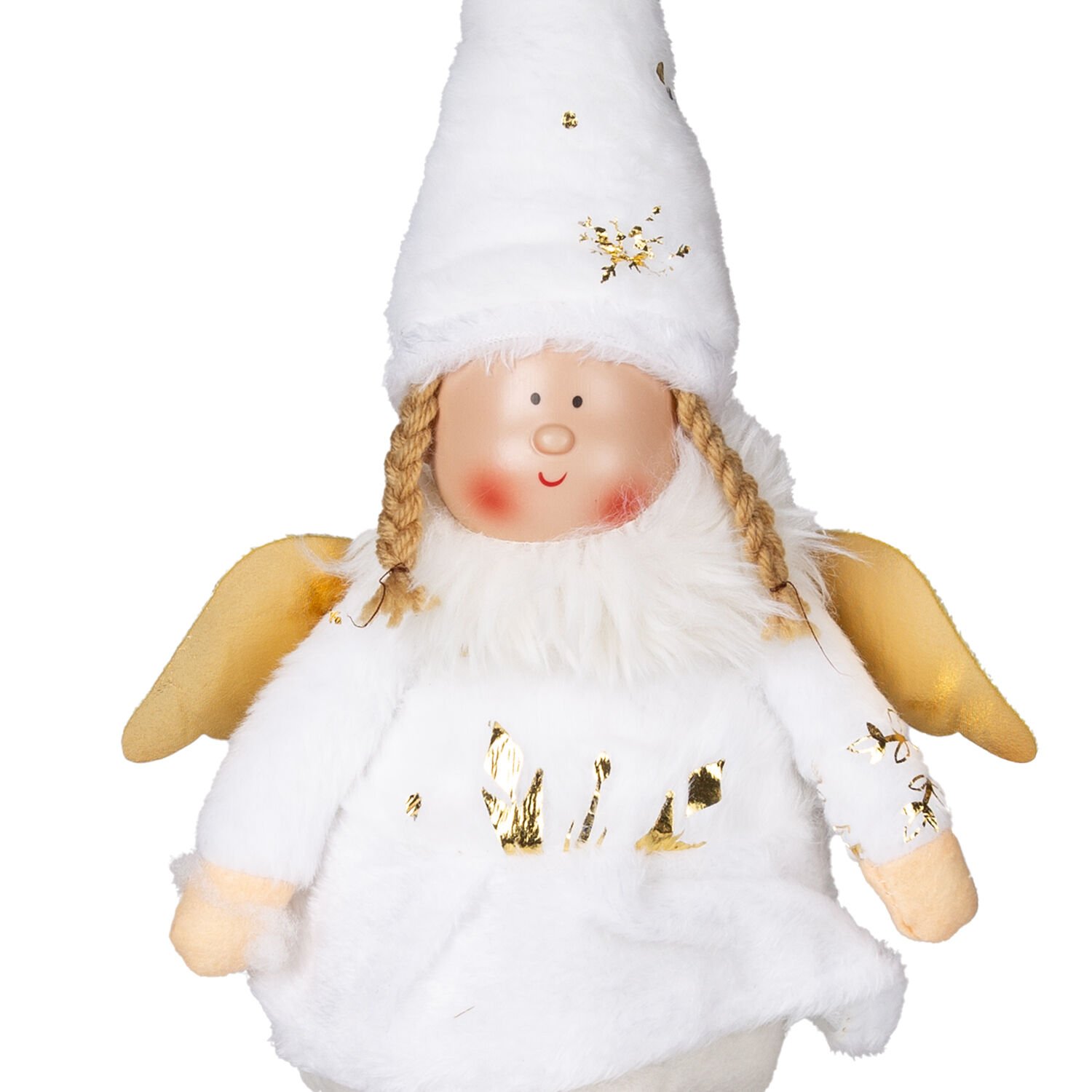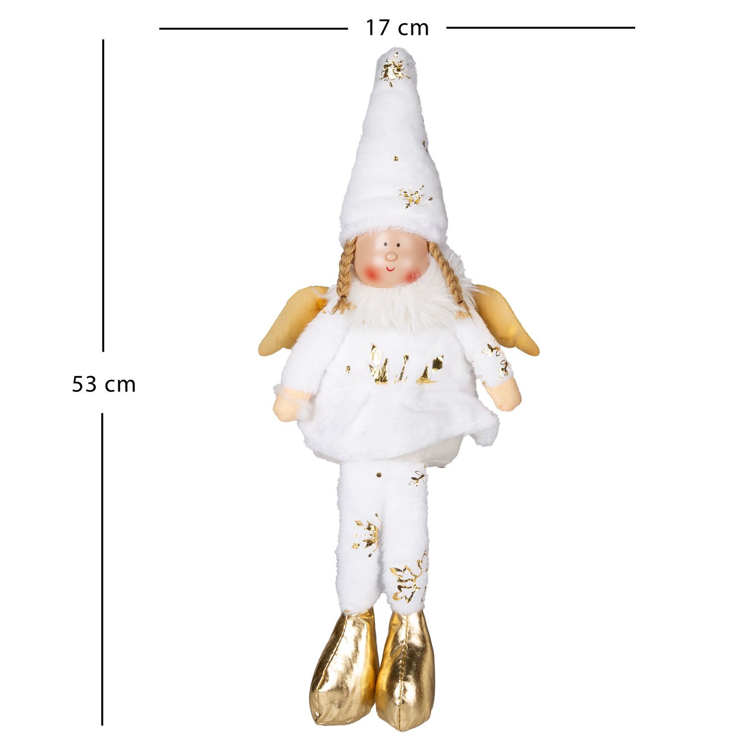 Zarif kanatlar ve gold ayakkabılar, figürün masalsı görünümünü tamamlar ve yılbaşı atmosferinize incelikli bir ışıltı katar. -