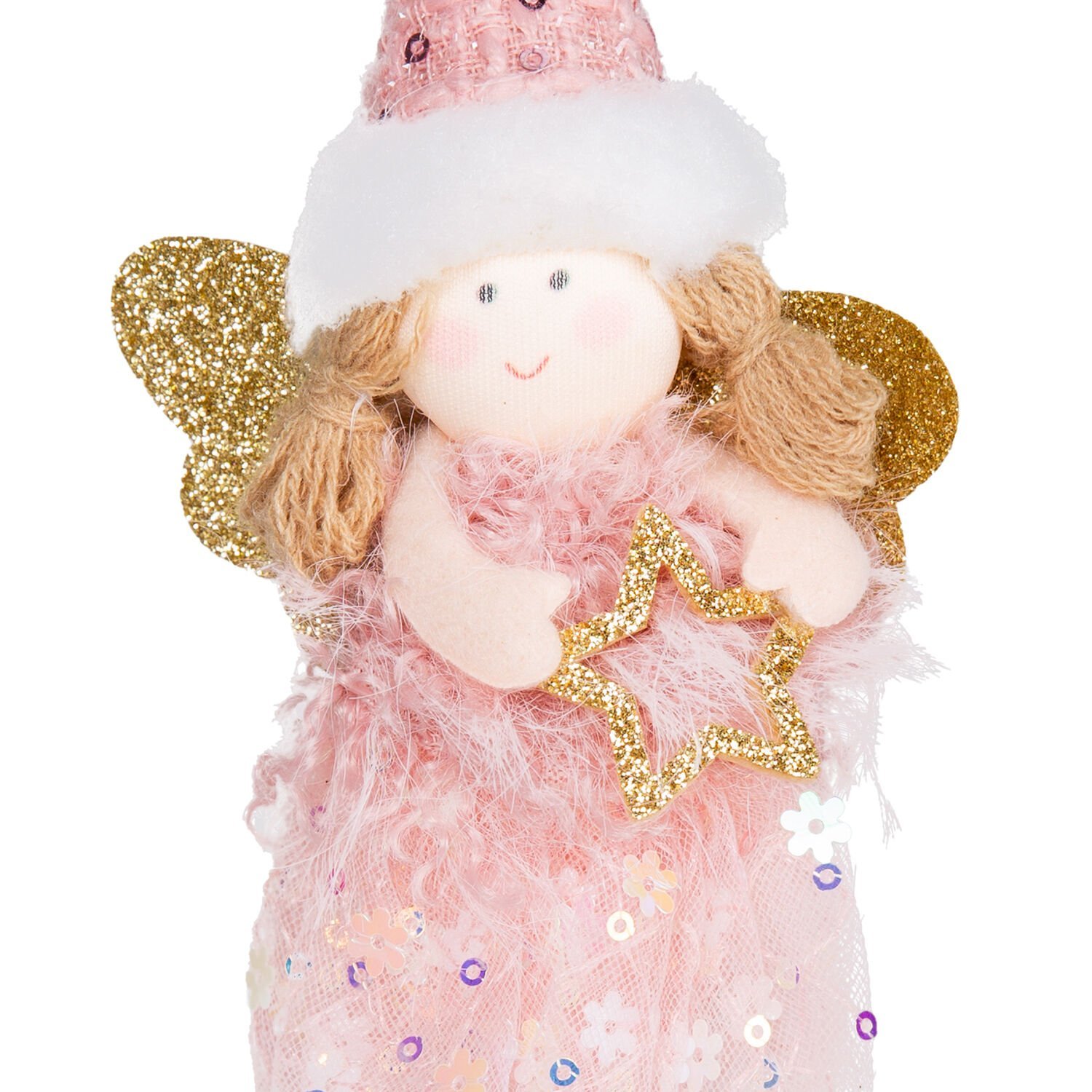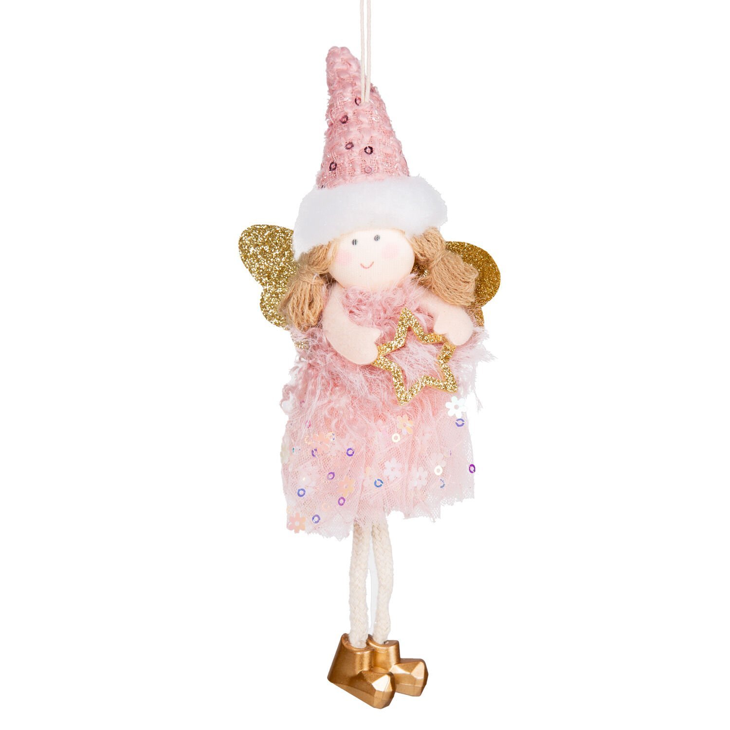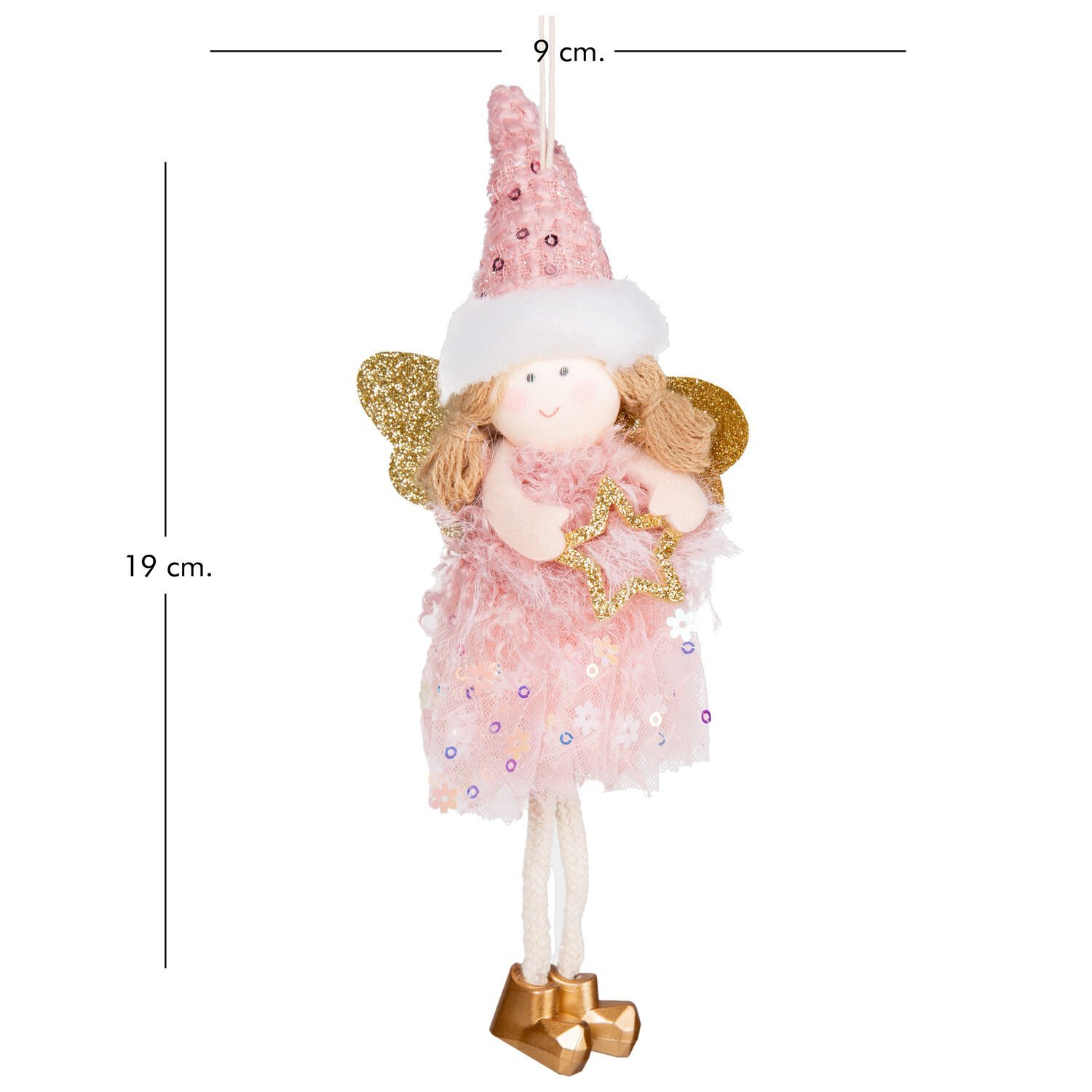 Yılbaşı Süsü, Peri Figürü, Gold-Pembe - Asmalı, Sarkan Ayaklı, Payetli Elbiseli, Payetli Şapkalı, Yıldız Tutan, 9x19 cm
