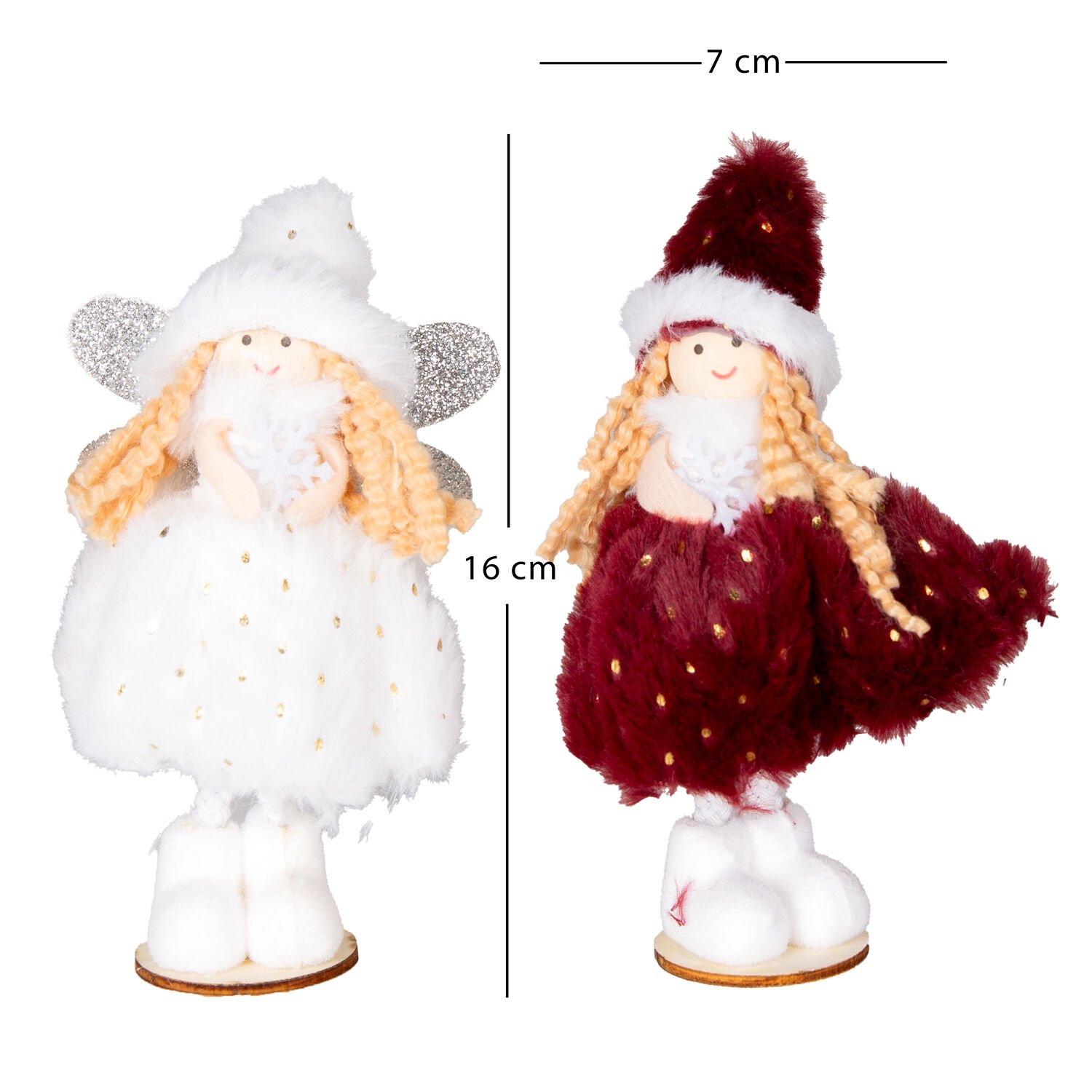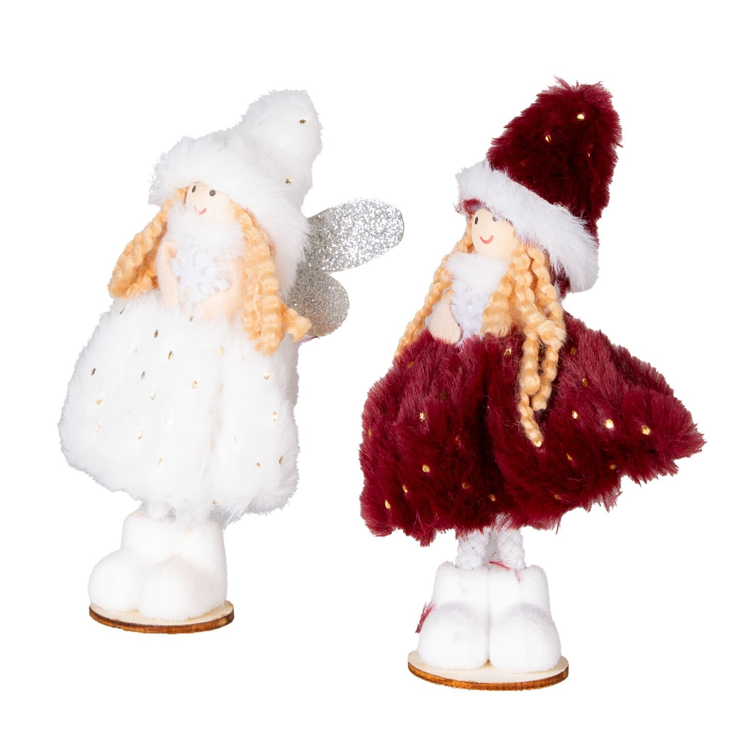 Yılbaşı Süsü, Peri Figürü, Kırmızı-Beyaz - Ayakta Duran, Ahşap Tabanlı, Gold Puantiyeli Elbiseli, Simli Kanatlı, Kutuda, 2'li Paket, 16 cm