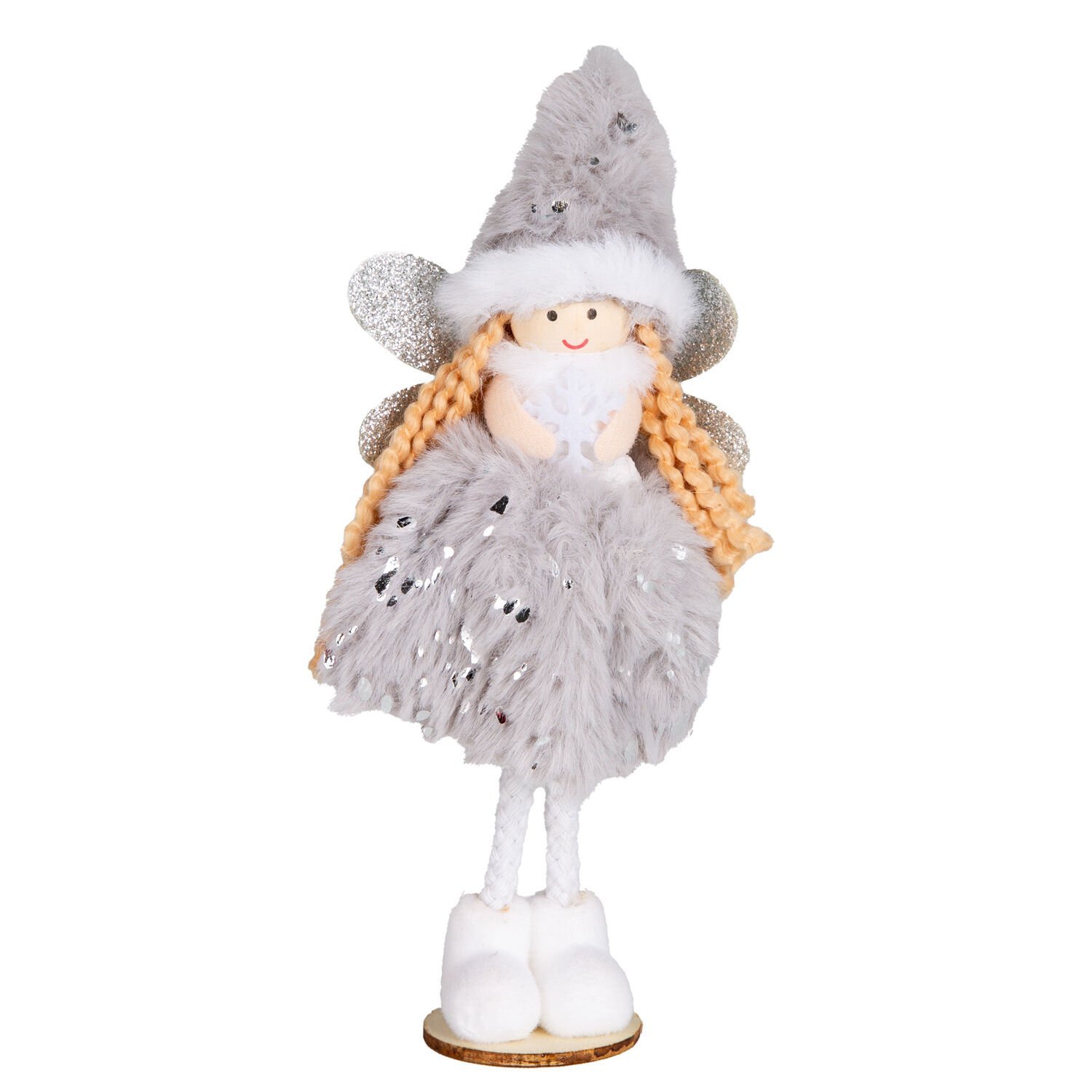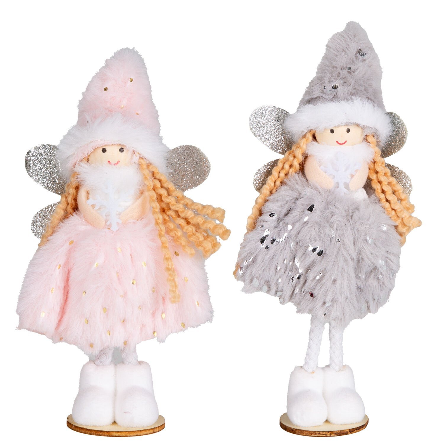 Yılbaşı Süsü, Peri Figürü, Pembe-Gri - Ayakta Duran, Ahşap Tabanlı, Simli Kanatlı, Kar Tanesi Tutan, Gold Puantiyeli ve Gümüş Payetli Elbiseli, Kutuda, 2'li Paket, 16 cm