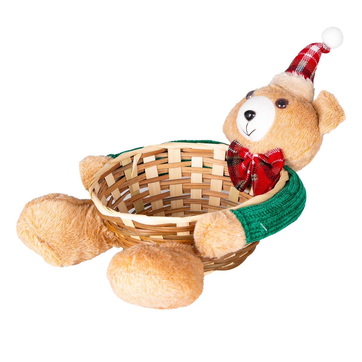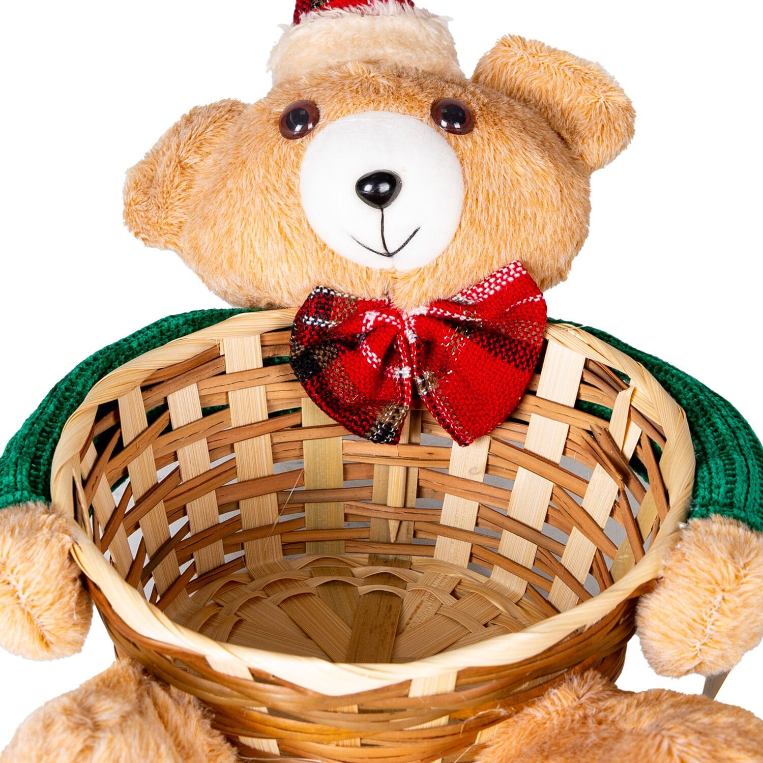Yılbaşı Süsü, Sepet, Kahverengi - Ayıcıklı, Hasır Örgü, Ekose Papyonlu, Ekose Şapkalı, Yeşil Kazaklı, 19x21 cm