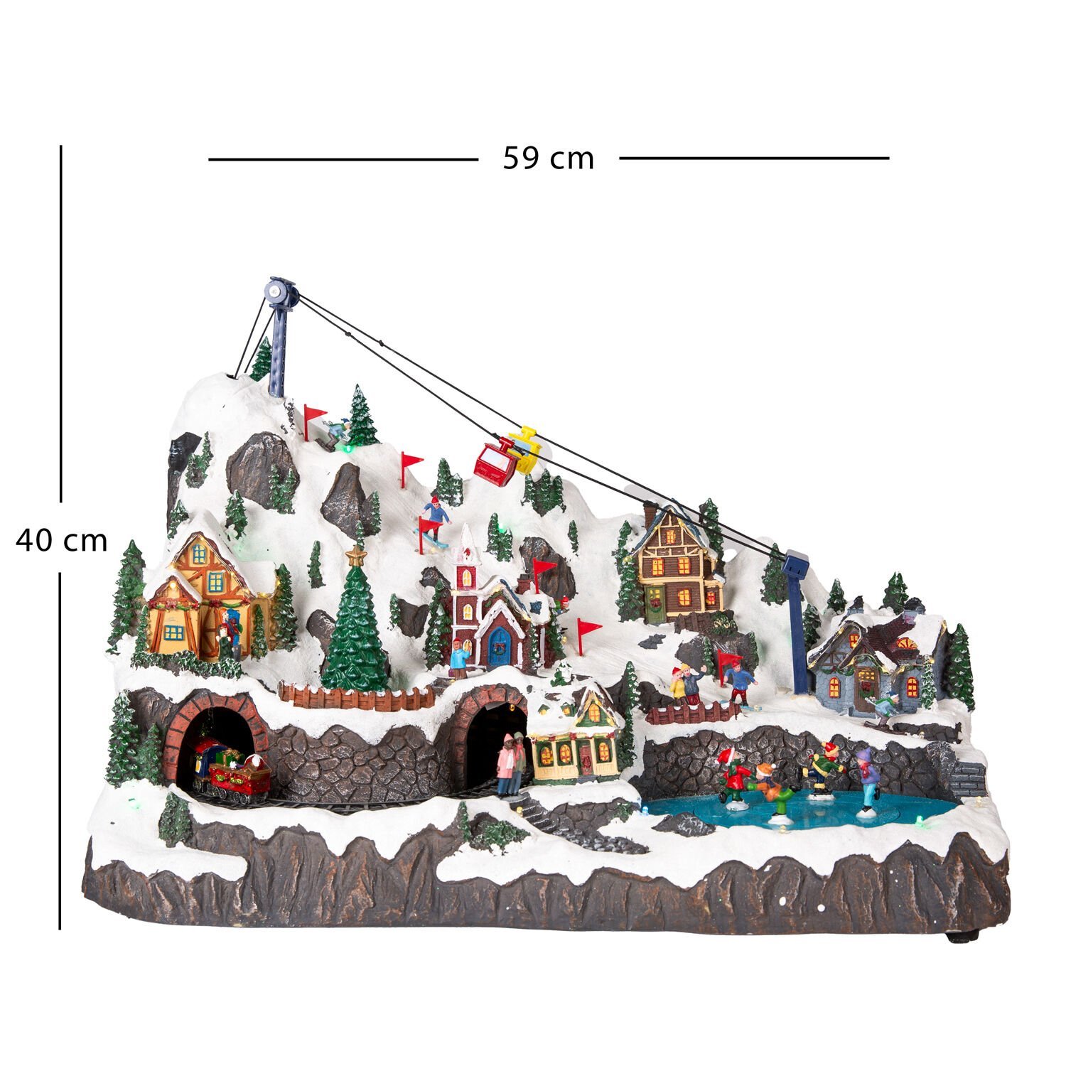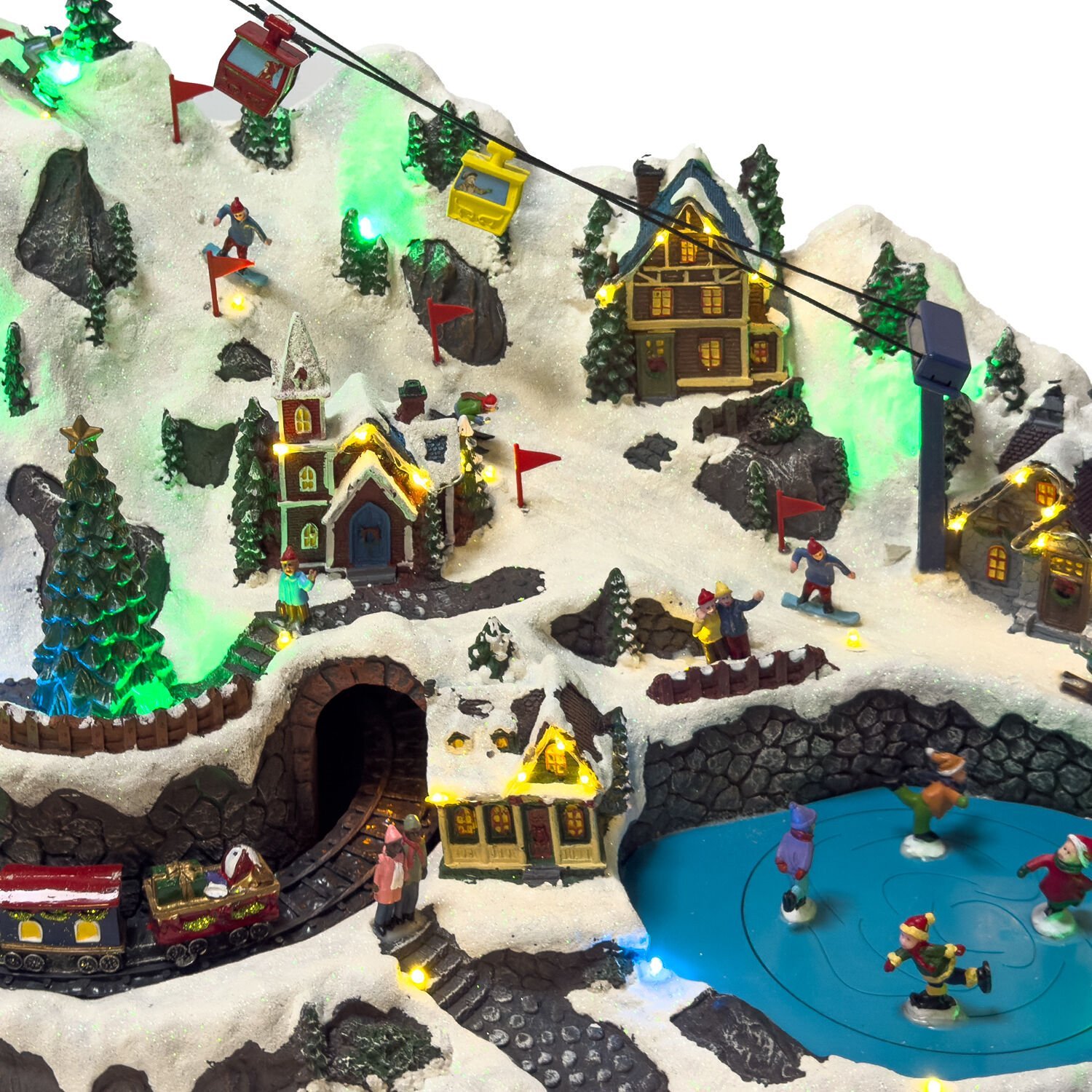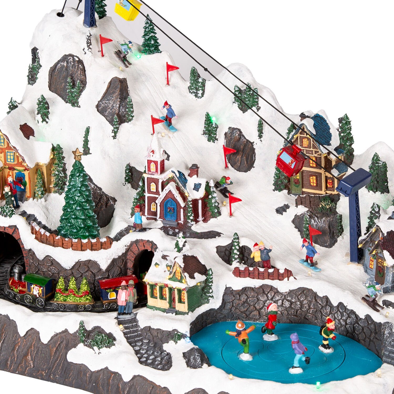 Karlı dağlar, kayakçılar ve ışıklı evler gibi detaylar, figürü kış tatilinin neşesini ve huzurunu yansıtan masalsı bir sahne yapar.