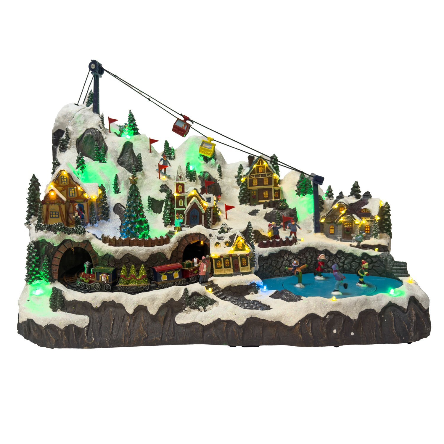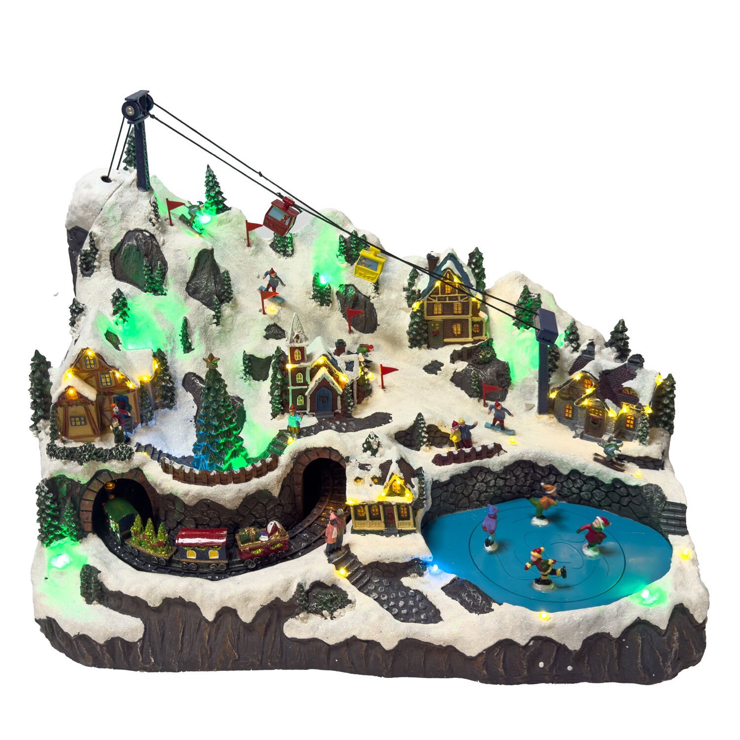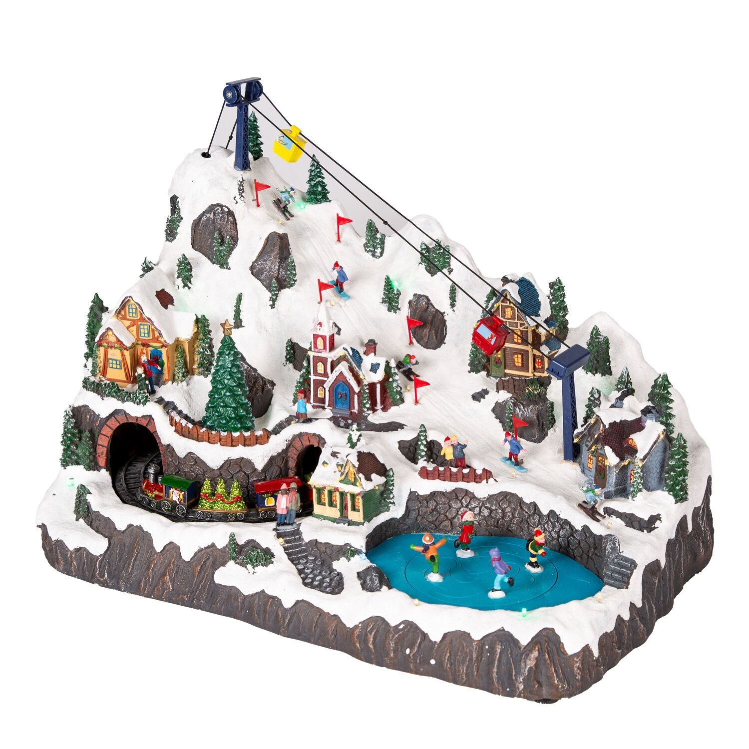 Karlı dağlar, kayakçılar ve ışıklı evler gibi detaylar, figürü kış tatilinin neşesini ve huzurunu yansıtan masalsı bir sahne yapar.