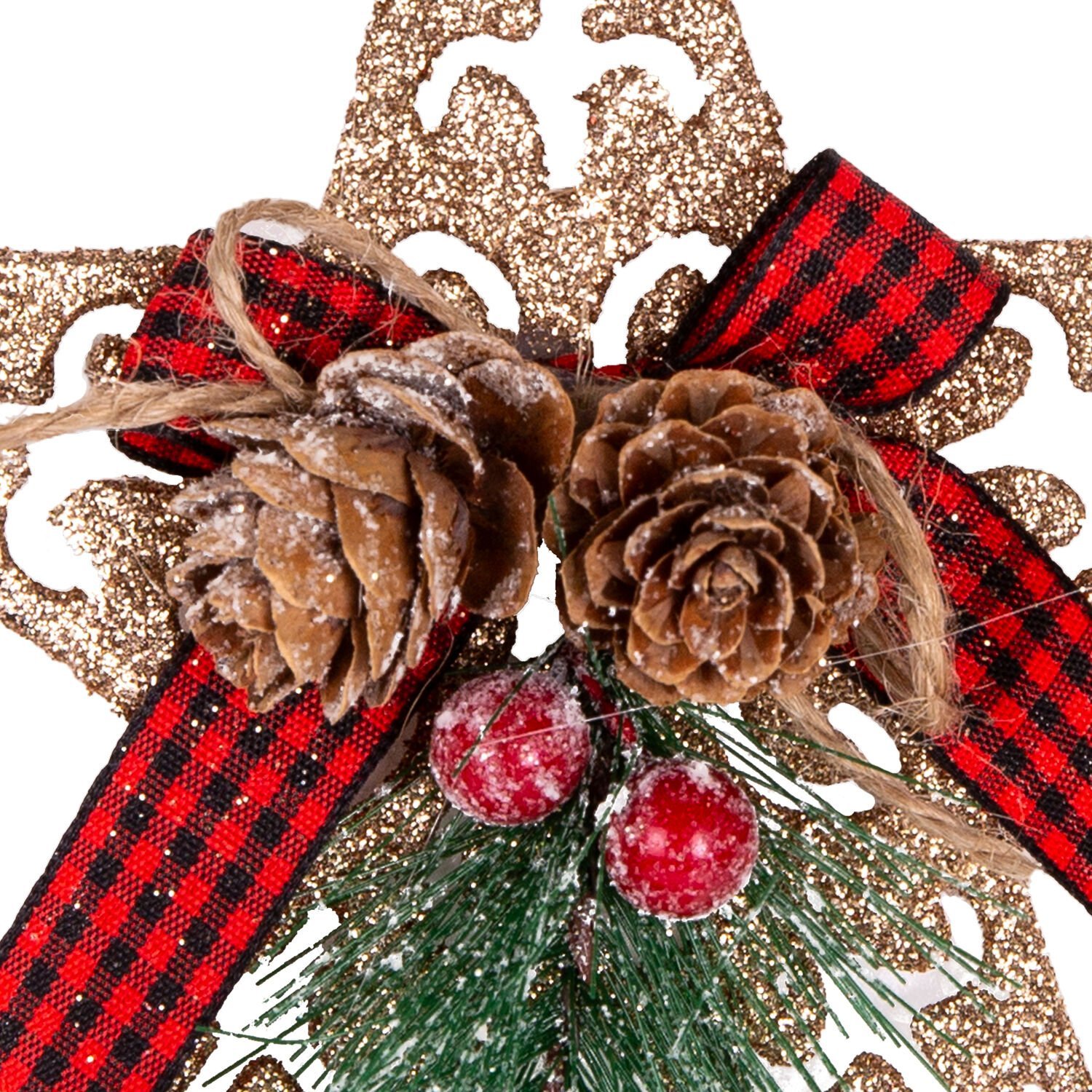 Yılbaşı Süsü, Yıldız, Gold - Yılbaşı Dekorlu, Ortası Kurdeleli ve Kozalaklı, Simli, 12x13 cm