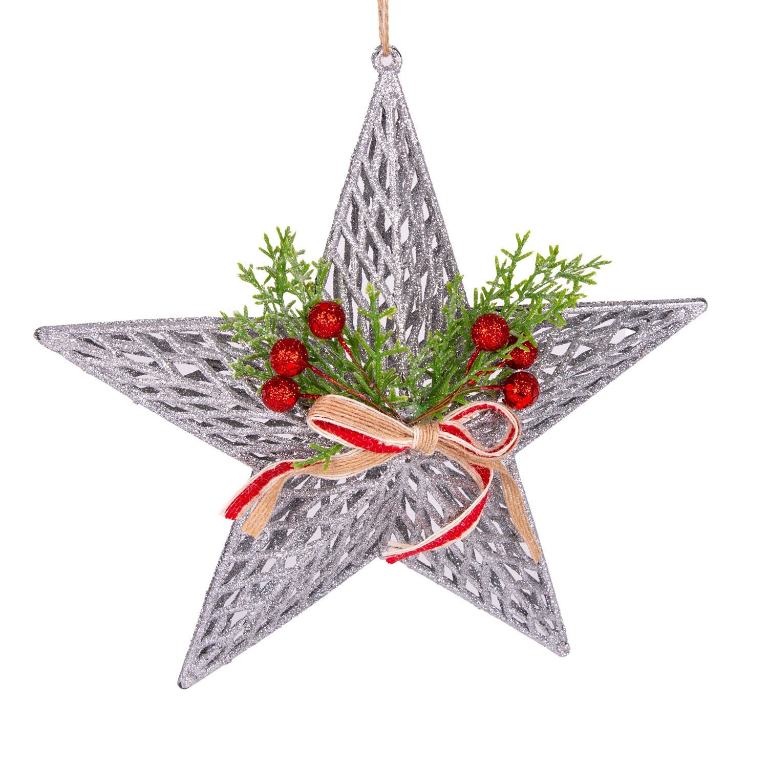 Yılbaşı Süsü, Yıldız, Yılbaşı Dekorlu, Fiyonklu, Berryli, Gümüş - 25x25 cm