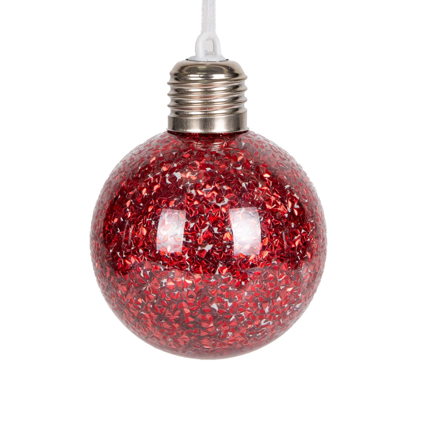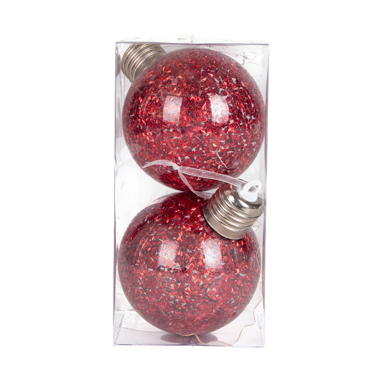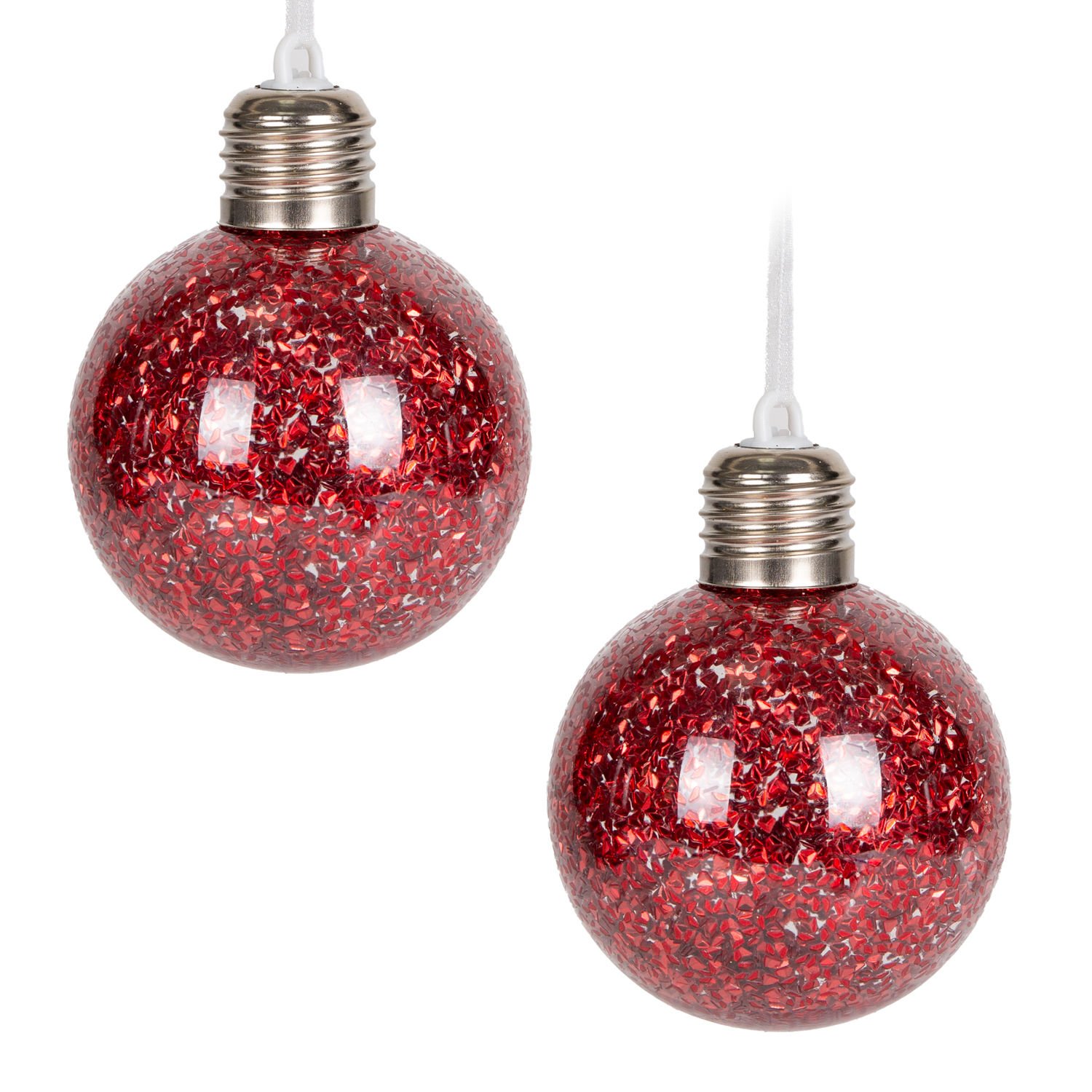 Yılbaşı Topu, Ampul, Kırmızı - Led Işıklı, Simli, 2'li Paket, 7 cm