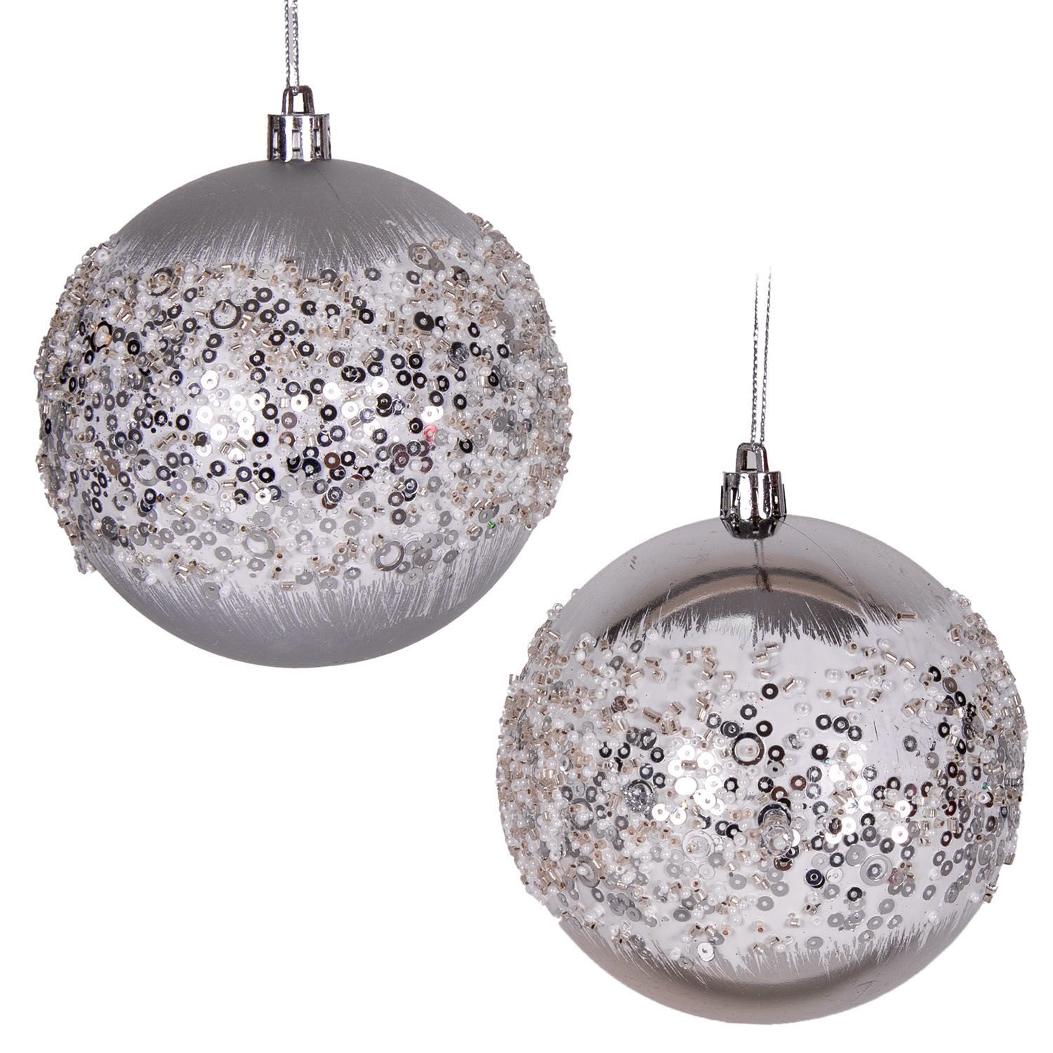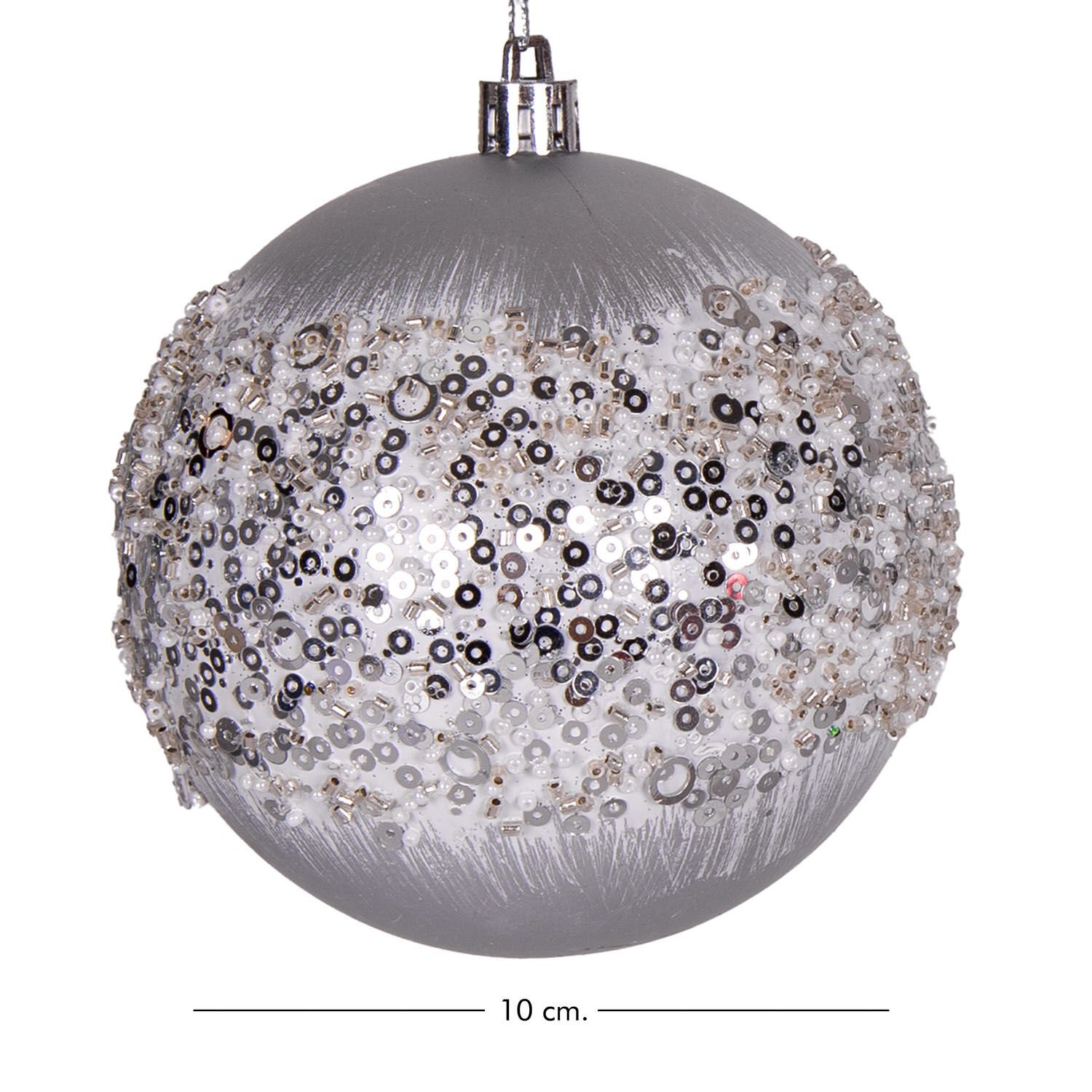 Yılbaşı Topu, Beyaz Boncuk ve Gold Halka Desenli, Gümüş - 2'li Paket, 10 cm