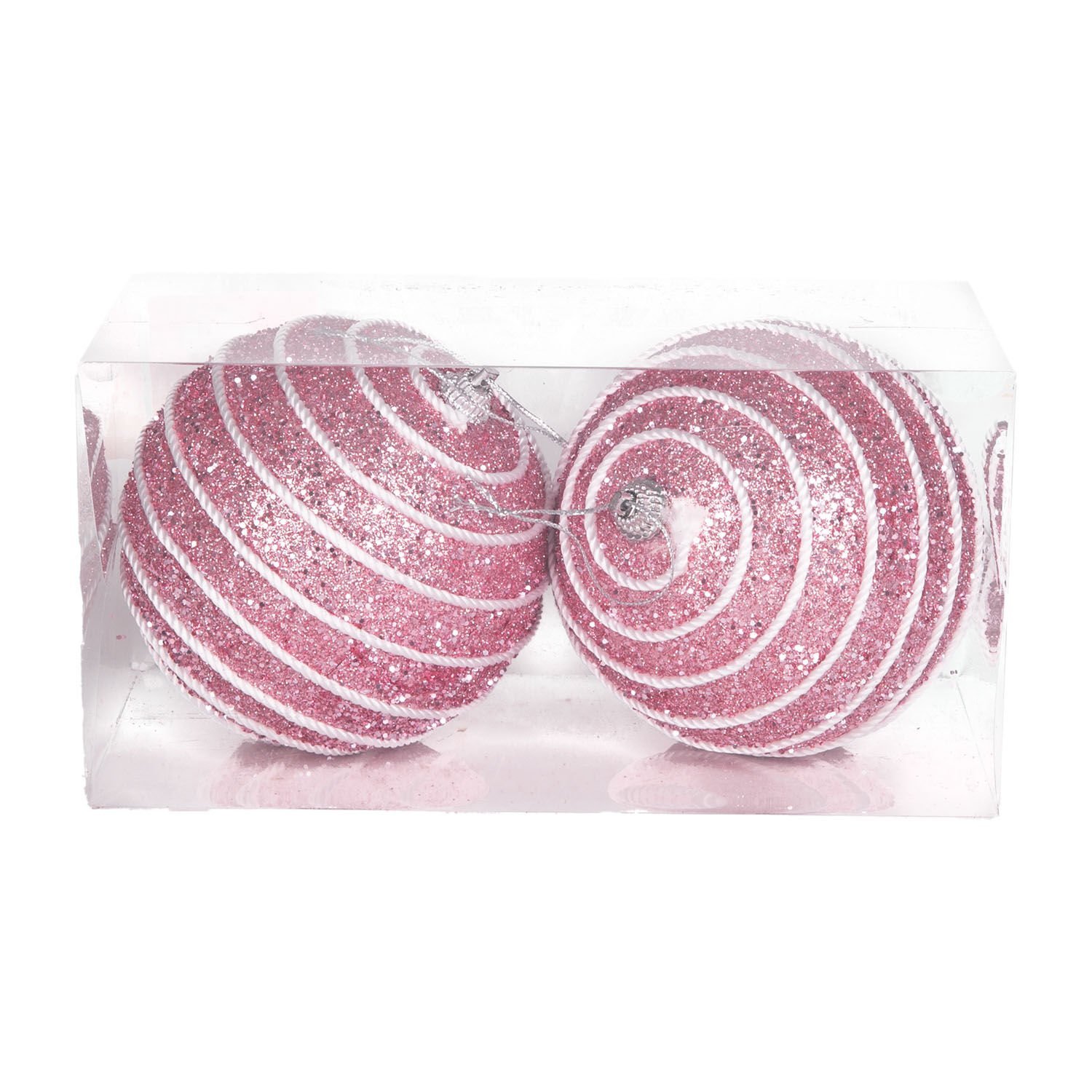 Yılbaşı Topu Seti (Pullu, Beyaz Şerit İp Desenli, Pembe, 9 cm, 2'li): Pembenin Tatlılığı ve Işıltılı Pulların Büyüsü