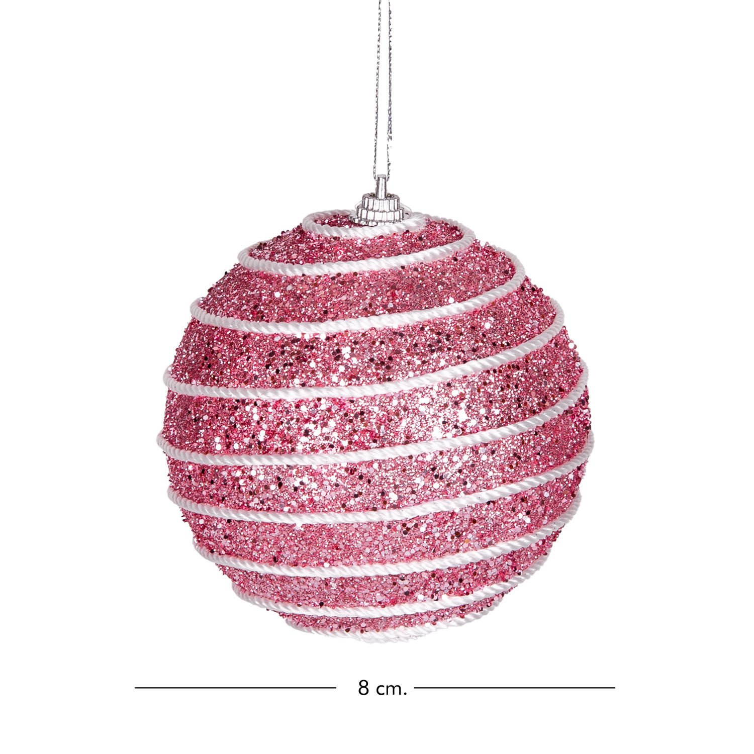 Yılbaşı Topu, Pullu, Beyaz Şerit İp Desenli, Pembe - 2'li Paket, 9 cm