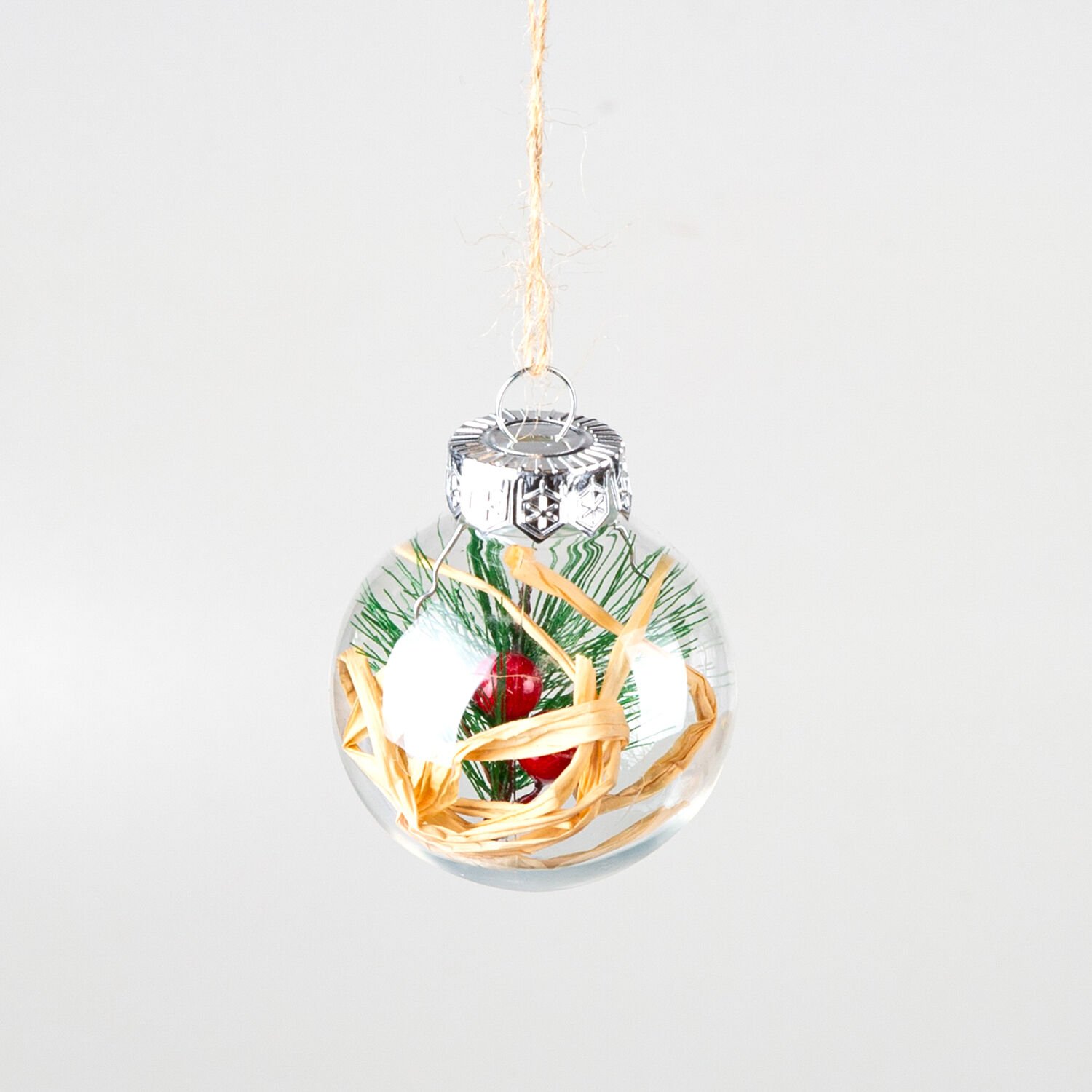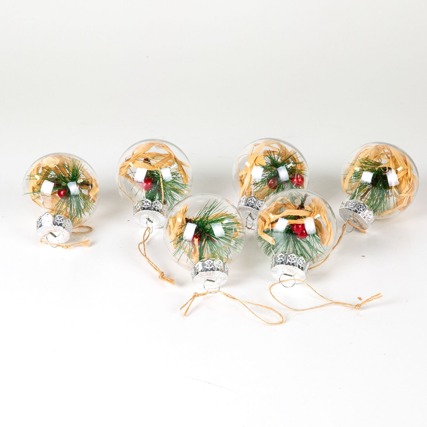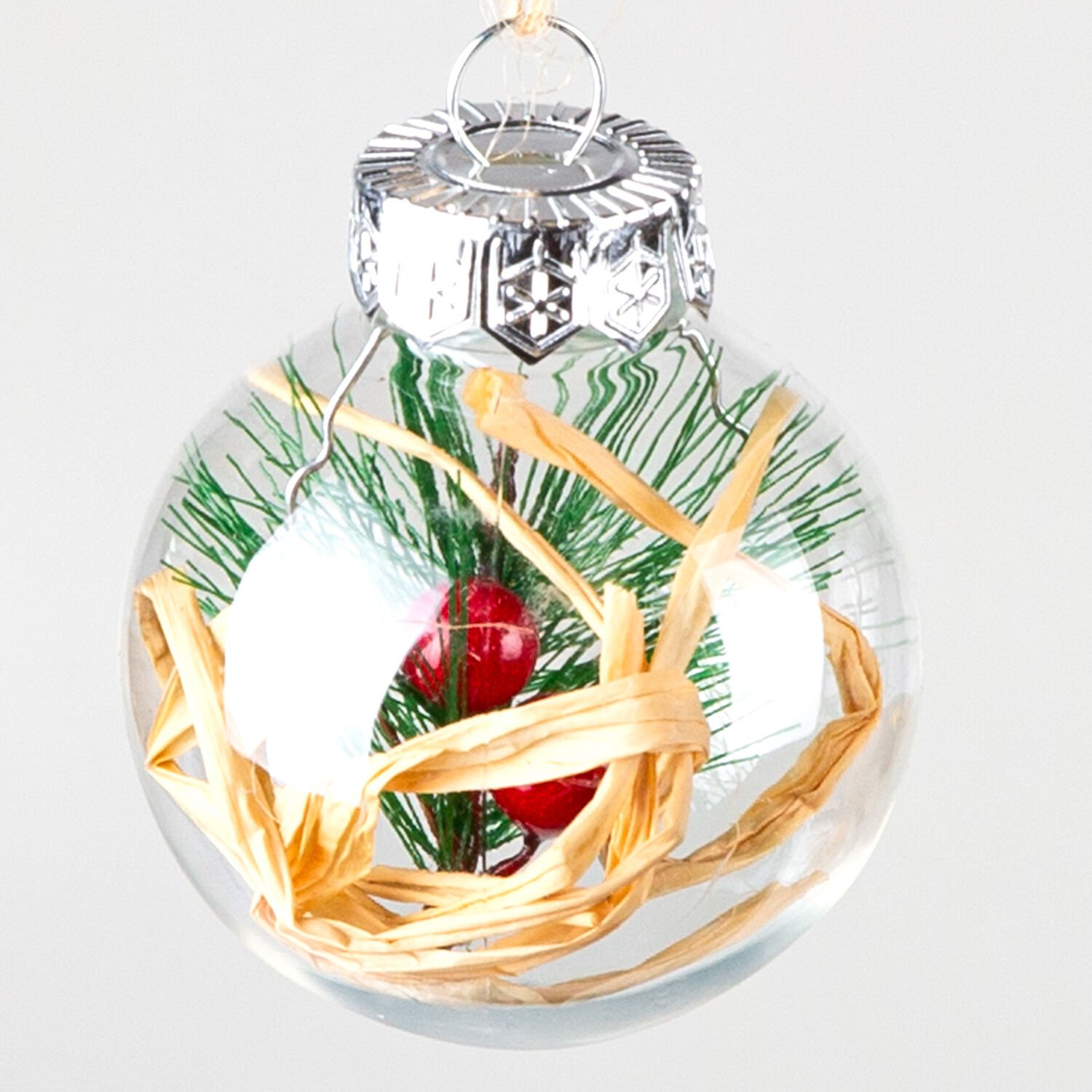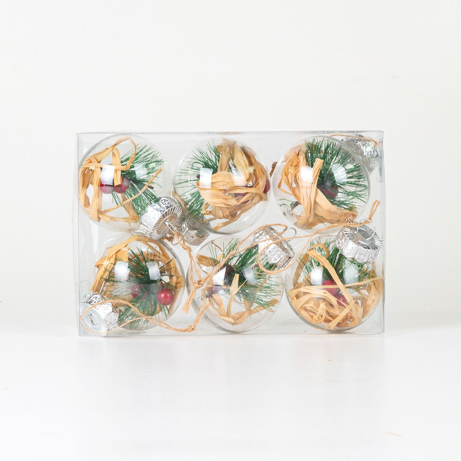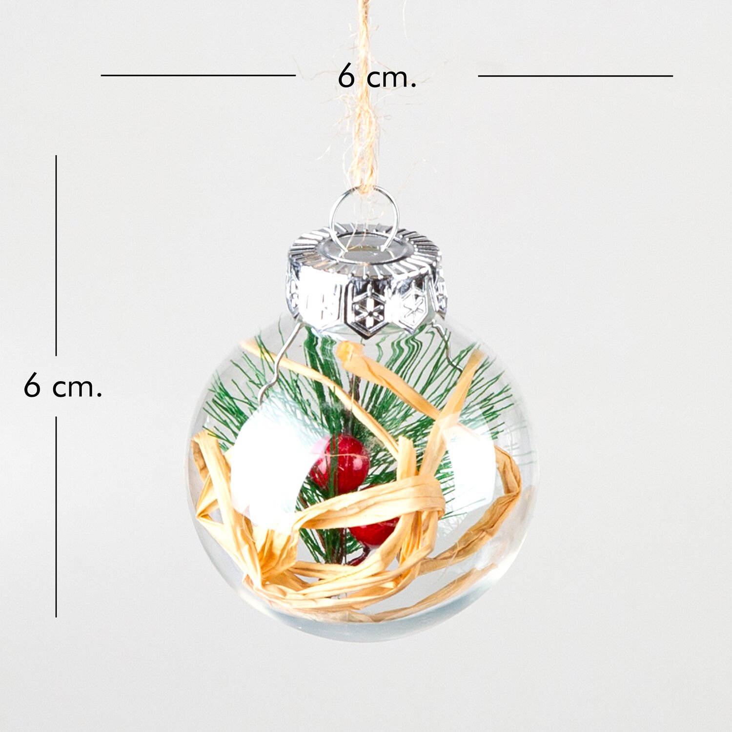 Yılbaşı Topu, Rafya ve Berry Dekorlu, Şeffaf - 6'lı Paket, 6x6 cm