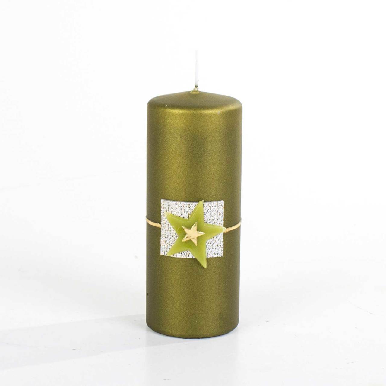 Yıldızlı yeşil kütük mum vaiana (oliv gold 336g) 6x15 cm - Yıldız figürüyle dikkat çeken kütük mum çeşitlerimiz arasından yılbaşı dekorlarına renk katıp, yılbaşı mumu olarak ortamlara farklı bir ambiyans katabileceğiniz dekoratif yıldızlı yeşil kütük mum.