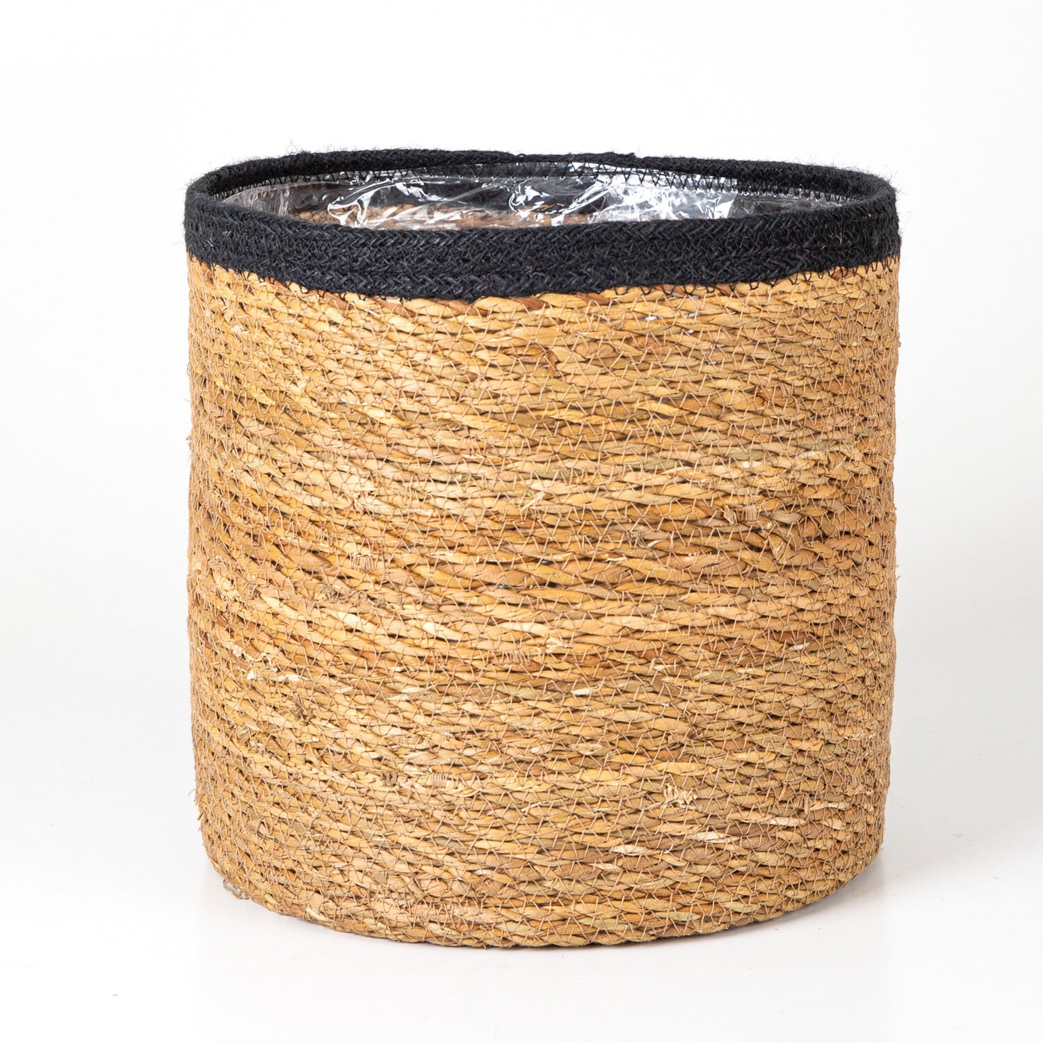 Siyah Kuşaklı Naylon İçli Yuvarlak Hasır Sepet Natural ( Ebat 26x26x26 Cm.)
