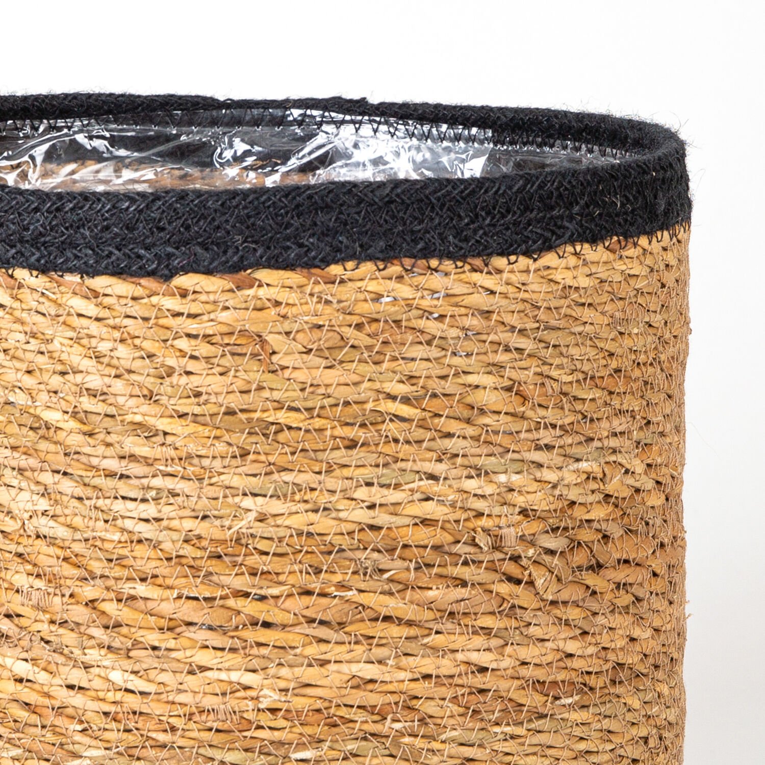 Yuvarlak Hasır Sepet, Siyah Kuşaklı, Naylon İçli, Natural-Siyah - 26x26x26 cm